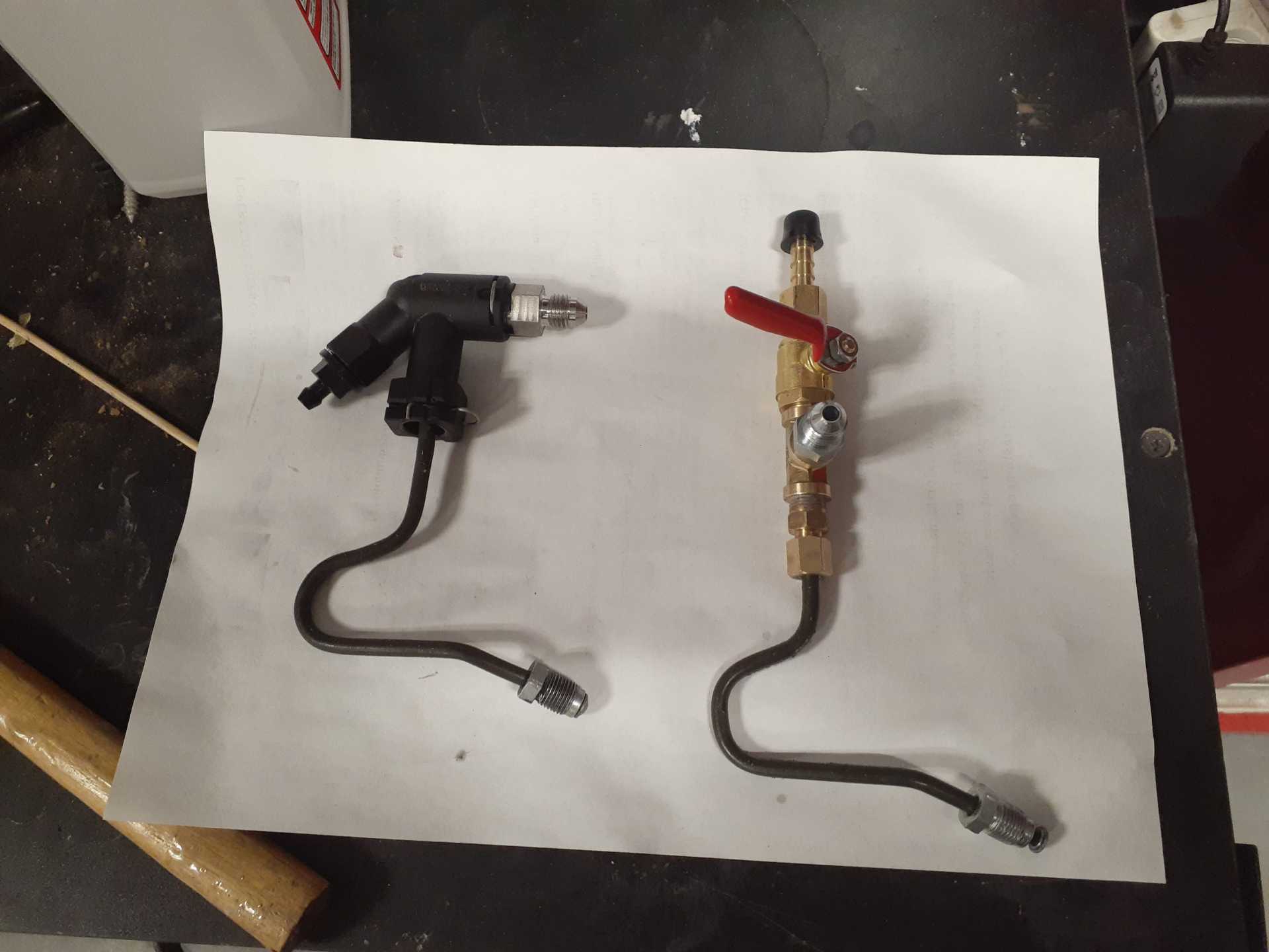 On the left is the plastic hydrolic fitting for the clutch slave and associated items that I could not get to stop leaking. On the right is my fabricated apparatus to serve the same function. Comments encouraged. Thanks Daryl