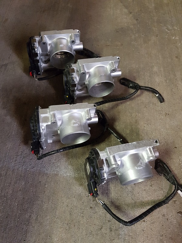 After cleaning them all up and sanding down the scaling, I ground off the top coolant tube to make them look just like the OEM Lambo throttle bodies and then cut out the butterfly valve (I'll need to use them as part of the air intake to the real throttle body so I obviously don't want any flow restriction). Finally, I masked them off and gave them a coat of paint to make them look like new again: