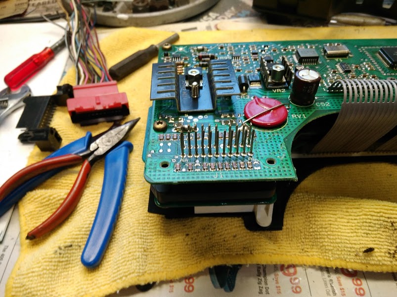 I have removed the rear connector from the spare (inop) Riviera digital IC. I am basically just testing how best to relocate the rear connector for final installation. Also testing how best to remove the connector pins that mate to the Riviera IC circuit board. For my case it would appear the best and perhaps easiest method is to heat the pins then remove when they become mobile. That is the method I will be using. Once the connector is removed I plan drill out the connector pin locations on the circuit board to facilitate the wire pigtail installation. If anyone has a better suggestion please do so!