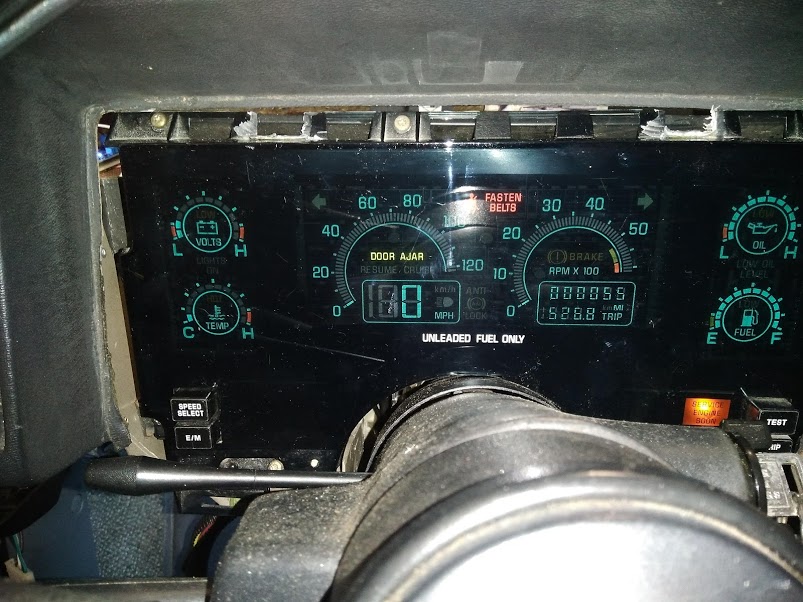 Here is what is working thus far: Turn signal indicators, emergency flasher, the gages (voltage, oil pressure, water temp and fuel level), seat belt indicator, Brake warning, cruise Resume, SES indicator, and tach.