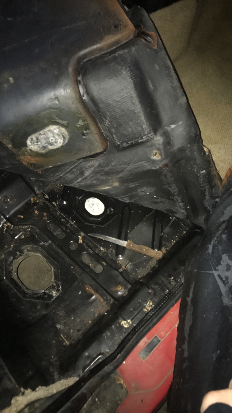 I'm debating what to do about the carpet. The car smells yucky, and according to Charlie(he's the one I bought the northstar Fiero from), it was filled of mouse poop when he got it. New carpeting is around $150, although the carpet is in pretty good shape. The foam just looks yucky. Oh well, not really an immediate concern. When I was peeling the carpet back I found something really strange.