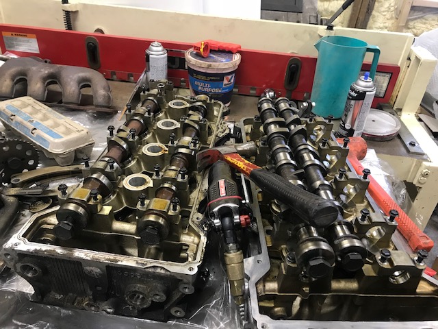 I worked on getting the cam bolts(10mm) off. They were coming off at first, and then they kept stripping, no matter which 10mm I used. I had to pound a 3/8in on to get quite a few off.