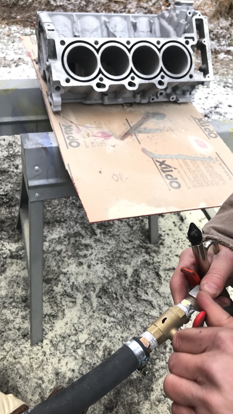 Mr. Eric bought a sand blaster, so we tested it out on the block. It looks great.