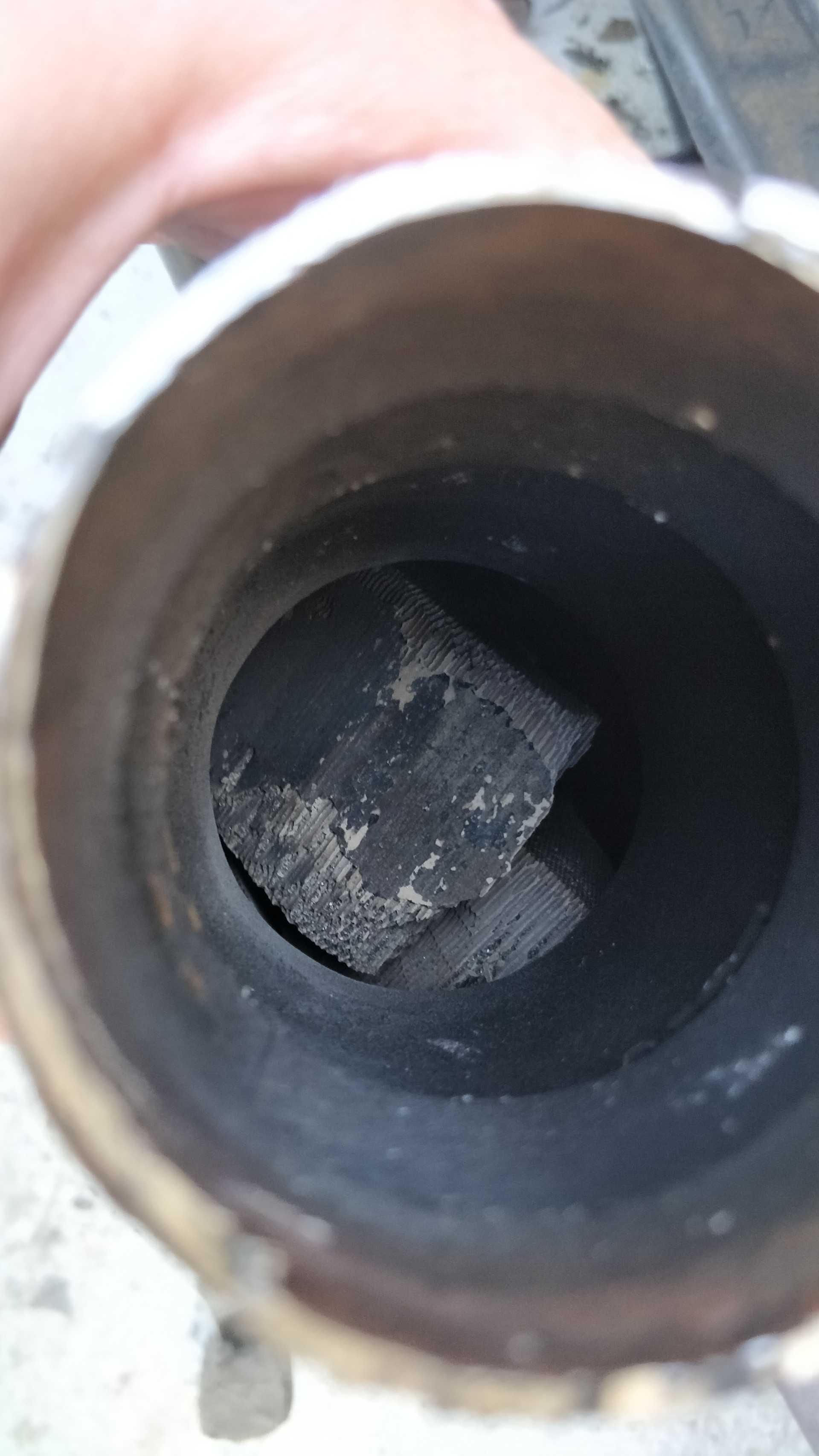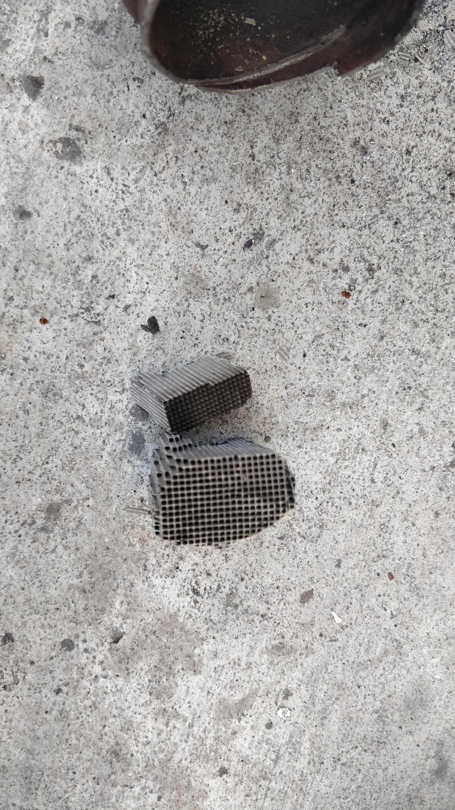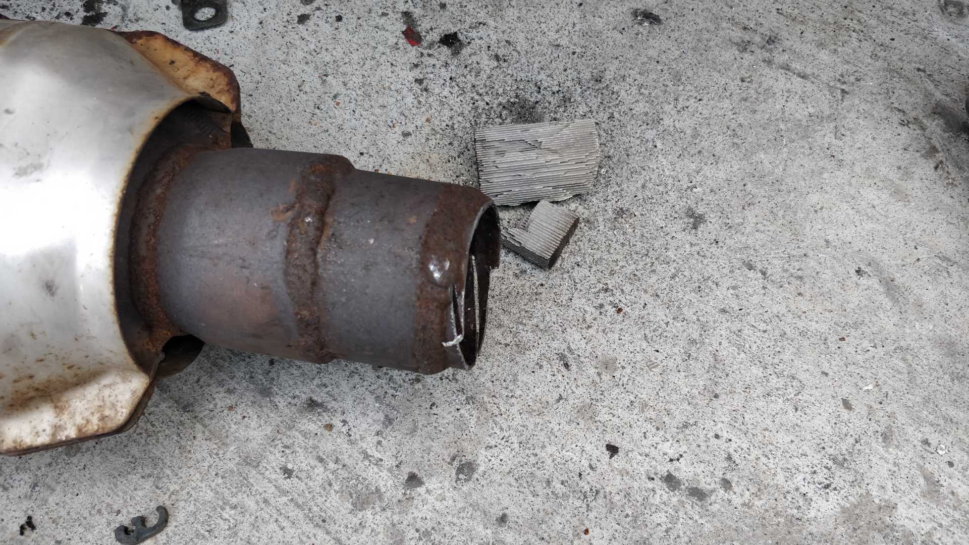 I cut off the CAT for inspection. The amount of smoke that this was puking lead me to think its probably toast even tho its only a couple years old. Sure enough as one side comes free i see CAT guts.
