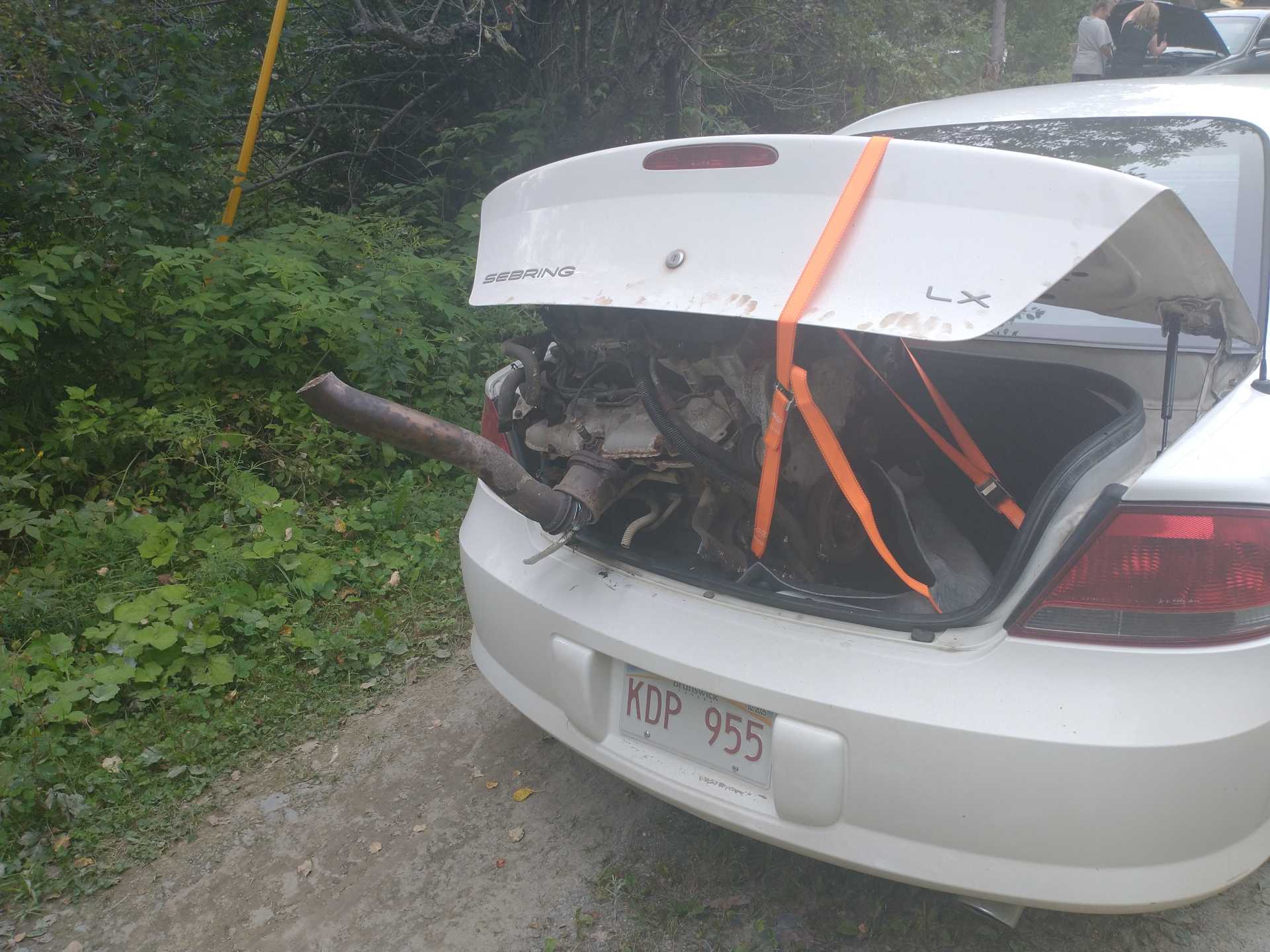 Well, I picked up the engine today, it appears in pretty good shape, rotates just with my hands on the crank pulley, but has the compression bumps (seems harder to turn over with a ratchet through the compression than my Fiero currently). It was loaded in my trunk with a backhoe, I drove with it in my trunk for 250kms, and unloaded with a lawn tractor with the arms on the front, worked surprisingly well, my Sebring is a beast haha. |