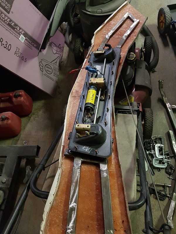 Unfortunately, although my active spoiler system worked perfectly, it of course doesn't quite fit in the available space. It would have required that I notch the engine trim which is not going to happen. I wasn't in the mood to redesign the system...again...so I've opted to use the active spoiler system from a Crossfire. I picked up a used one for cheap. It fits perfectly, and works perfectly. The only thing I'll have to add is a potentiometer to measure the exact angle. It comes with two micro switches to indicate the upper and lower limits, but these won't be of any help (well the lower switch can be used, but not the upper switch). The spoiler actually opens much higher (angle) than needed at it's full height, but once I get the potentiometer installed then my controller can regulate the positions. I built a mounting frame and the unit just drops in place and will be secured with the stock mounting bolts. I welded the spoiler attachment brackets to the metal frame (internal stiffening for the spoiler) that I had created. This allows the spoiler to be unbolted from the hinges with a couple of hex screws per side (these brackets also allow for a little bit of alignment adjustment should it be needed later on). After the spoiler system and the spoiler internal frame were installed, I was able to mount the top fibreglass piece to its frame using urethane adhesive. I added a foam core and finished it off with fibreglass. Just fairing the surface now. A lot of work for a side of the spoiler that will only be visible if someone is a couple feet off my bumper while I'm driving at 70mph.