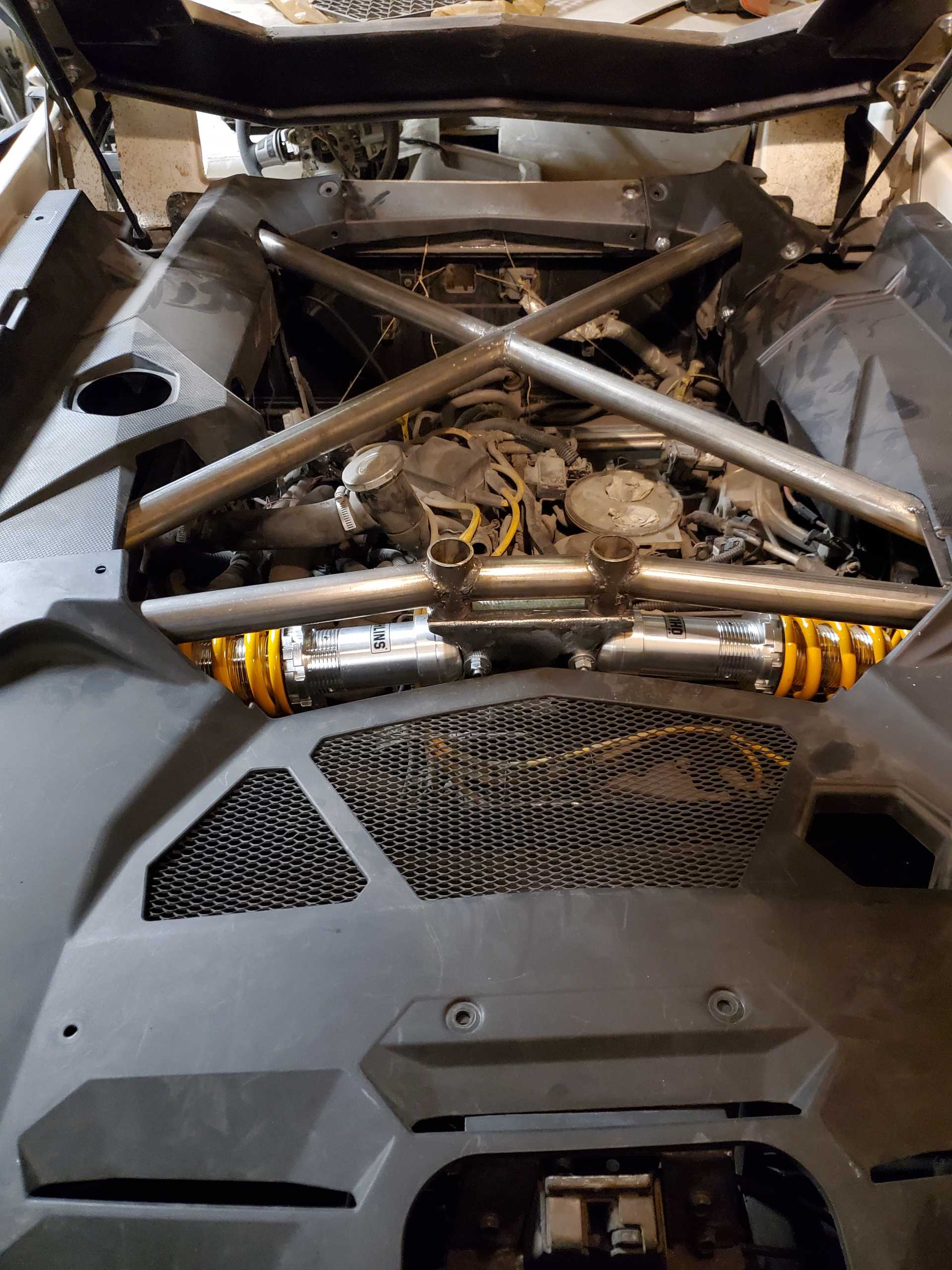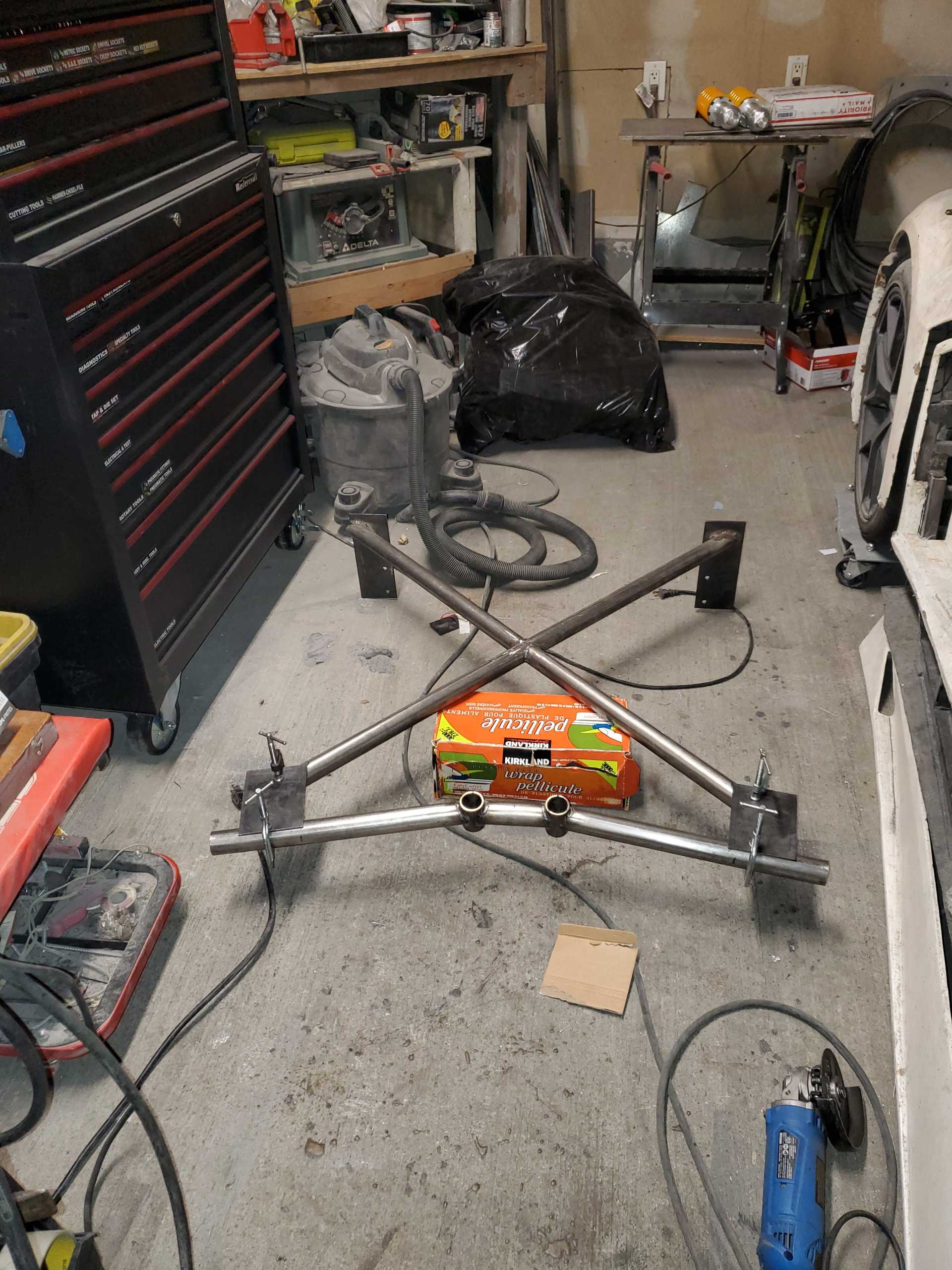 The cross brace, shock support and the shocks are now installed. I will paint the bracing later once it warms up a bit and will get some nicer looking bolts to dress things up. The bracing is fully structural to compensate from the Fiero trunk wall/ brace being completely removed now.
