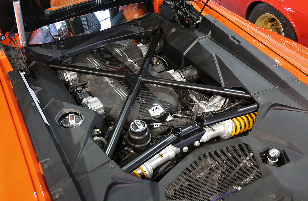 For those that didn't know, the rear shocks of the Aventador are visible in the engine bay, even when the hatch is closed. The springs are typically color matched to the calipers.