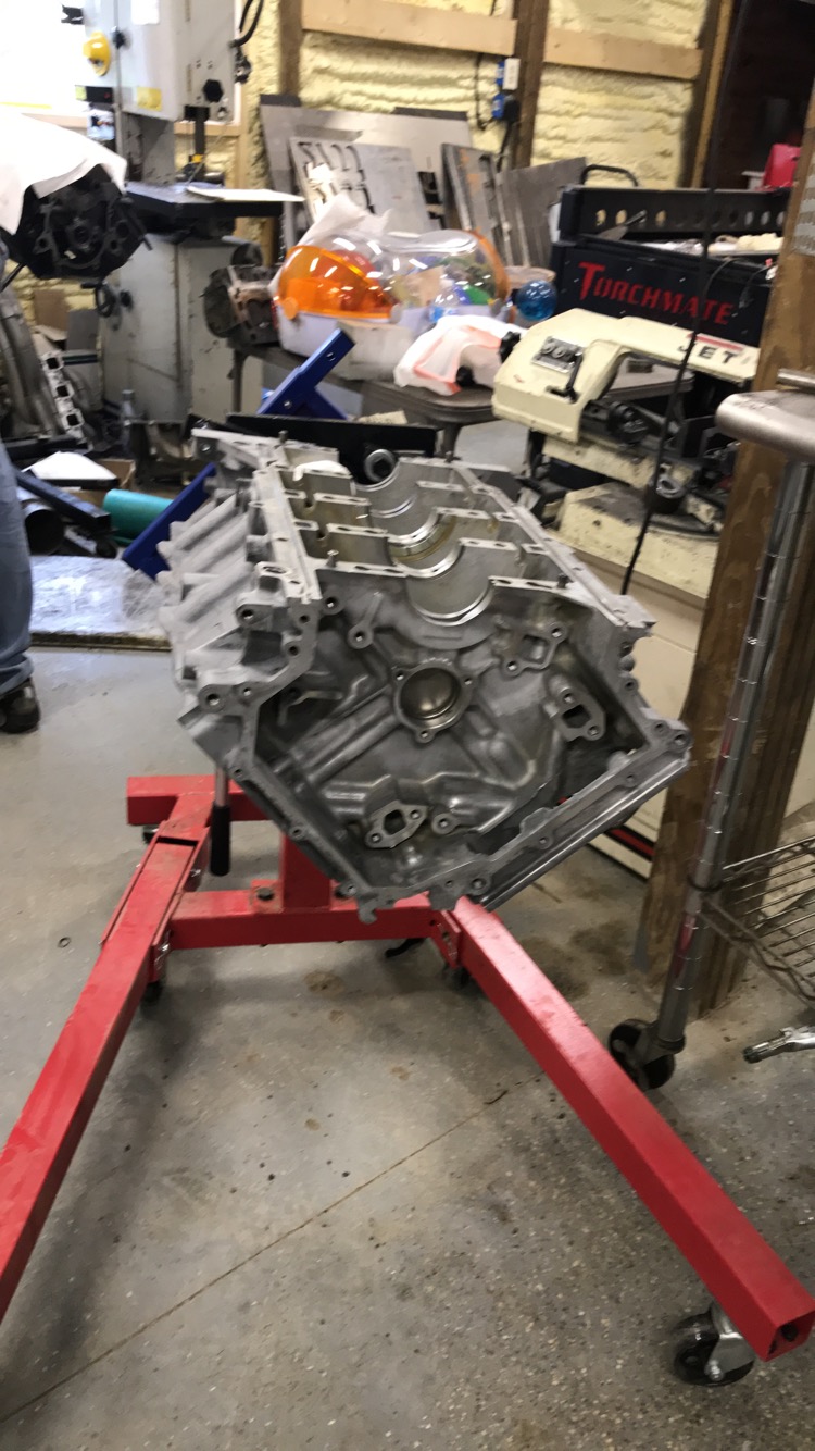 Trying to figure out how to dangle the engine so it would fit on the cradle yet still be on the engine stand so we could roll it was tricky.