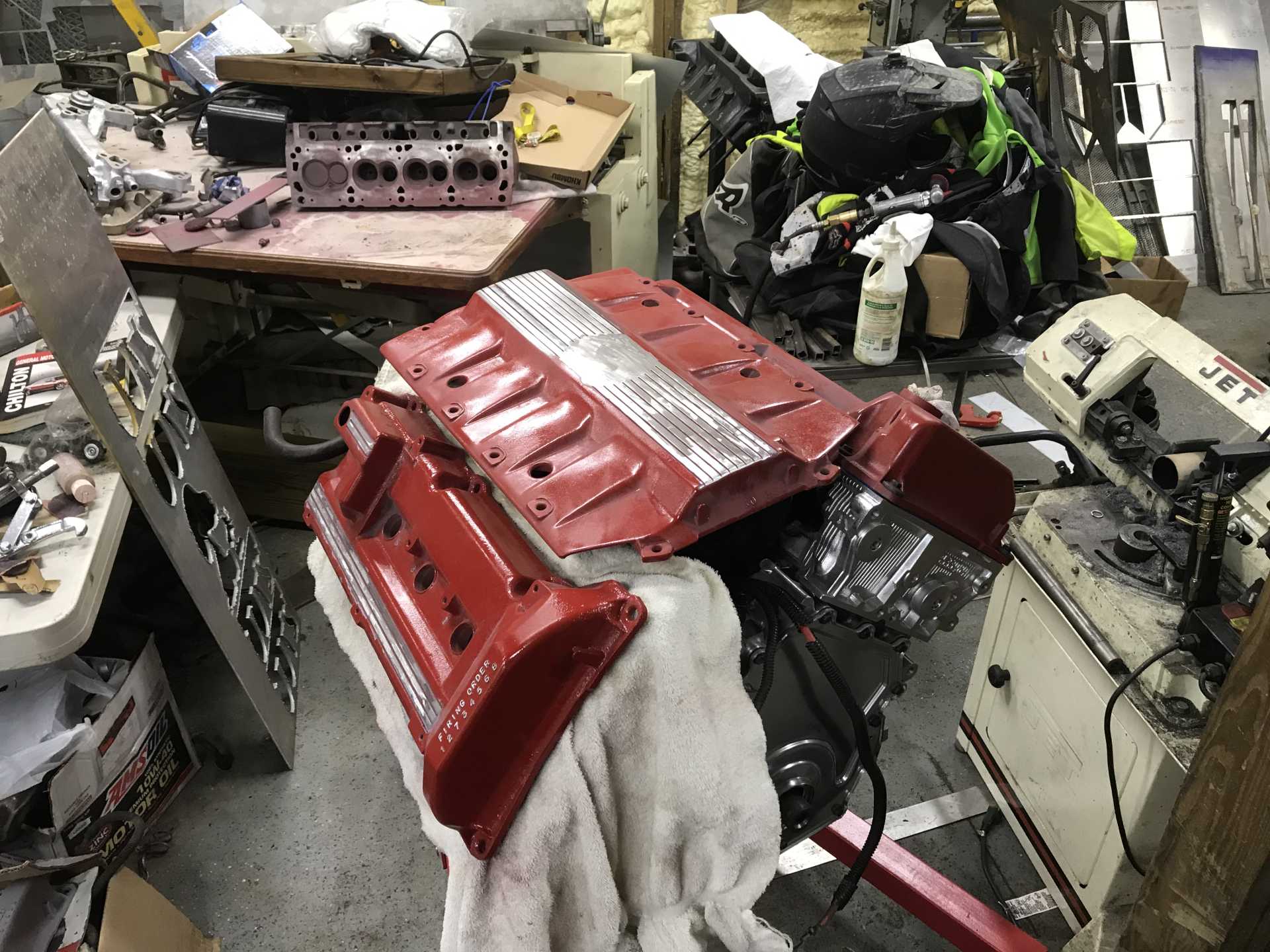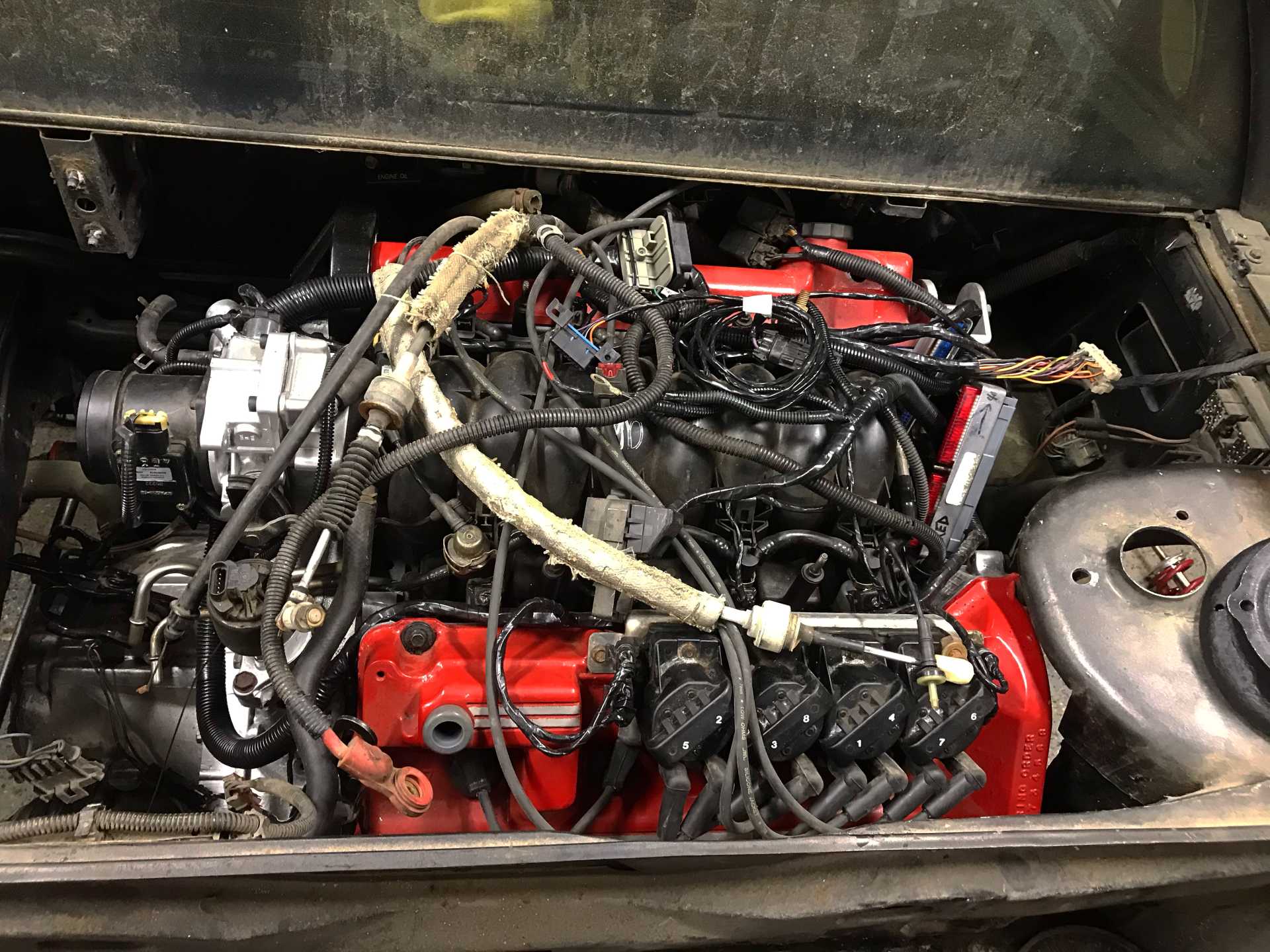 Valve covers secured down and intake is on. Little did I know it would be coming on and off for a while due to wiring issues.