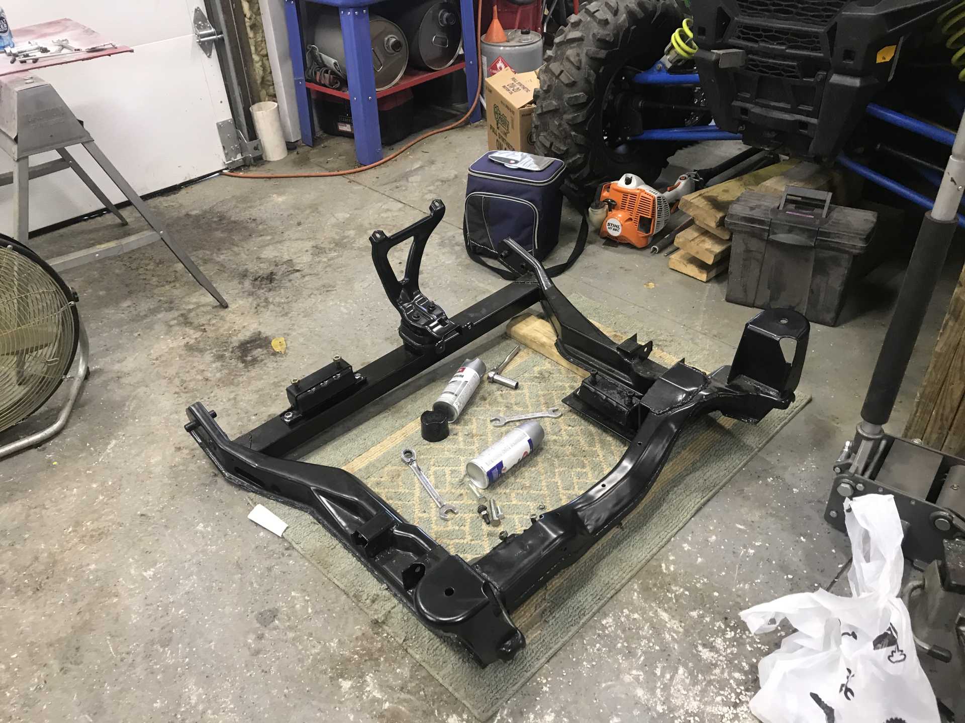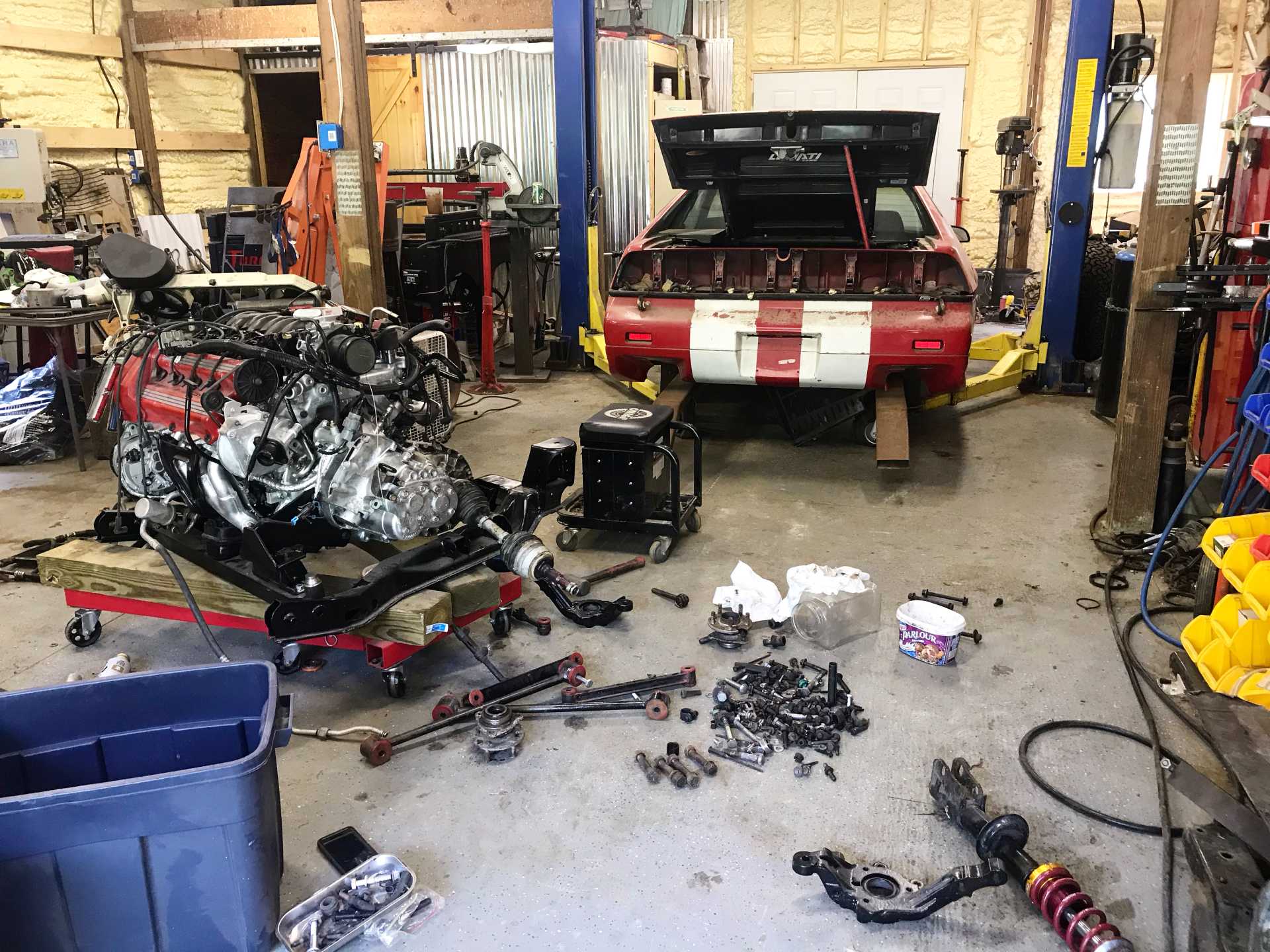 Huge step. Dragged my cradle and the components from under my dad’s Jeep because it was finally time to mount the engine. When I bought my Fiero, the PO has the engine mounted, so these are custom to him. There are two chevy 4x4 mounts, a Caddy mount(rear bank), and a Fiero mount(transmission).