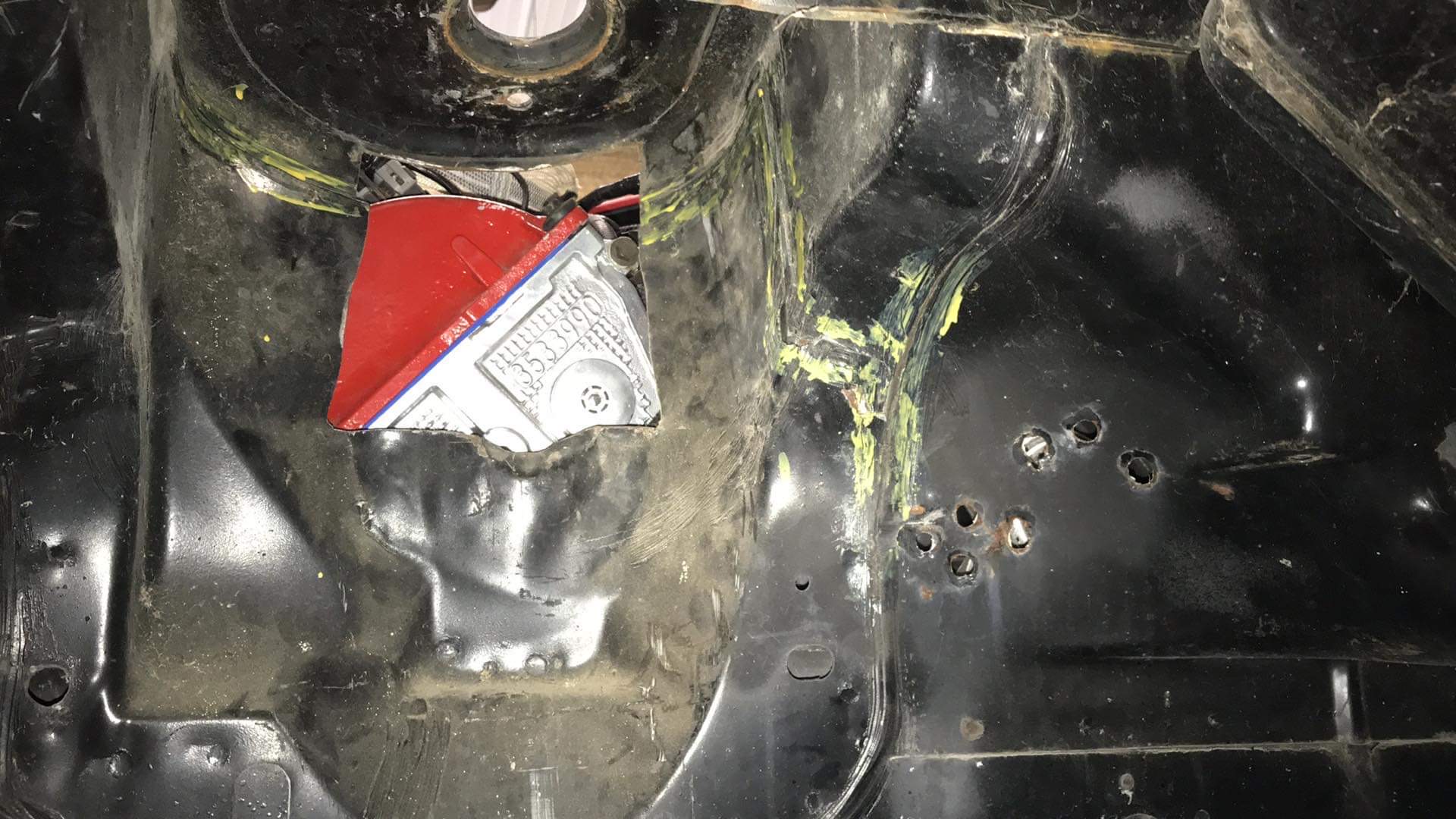 The passenger side balance cover also went through the strut tower. The PO had already cut out the middle of the tower to make it clear, but did nothing to reinforce it. So my friend being the master welder he is, fixed up the hacked tower.