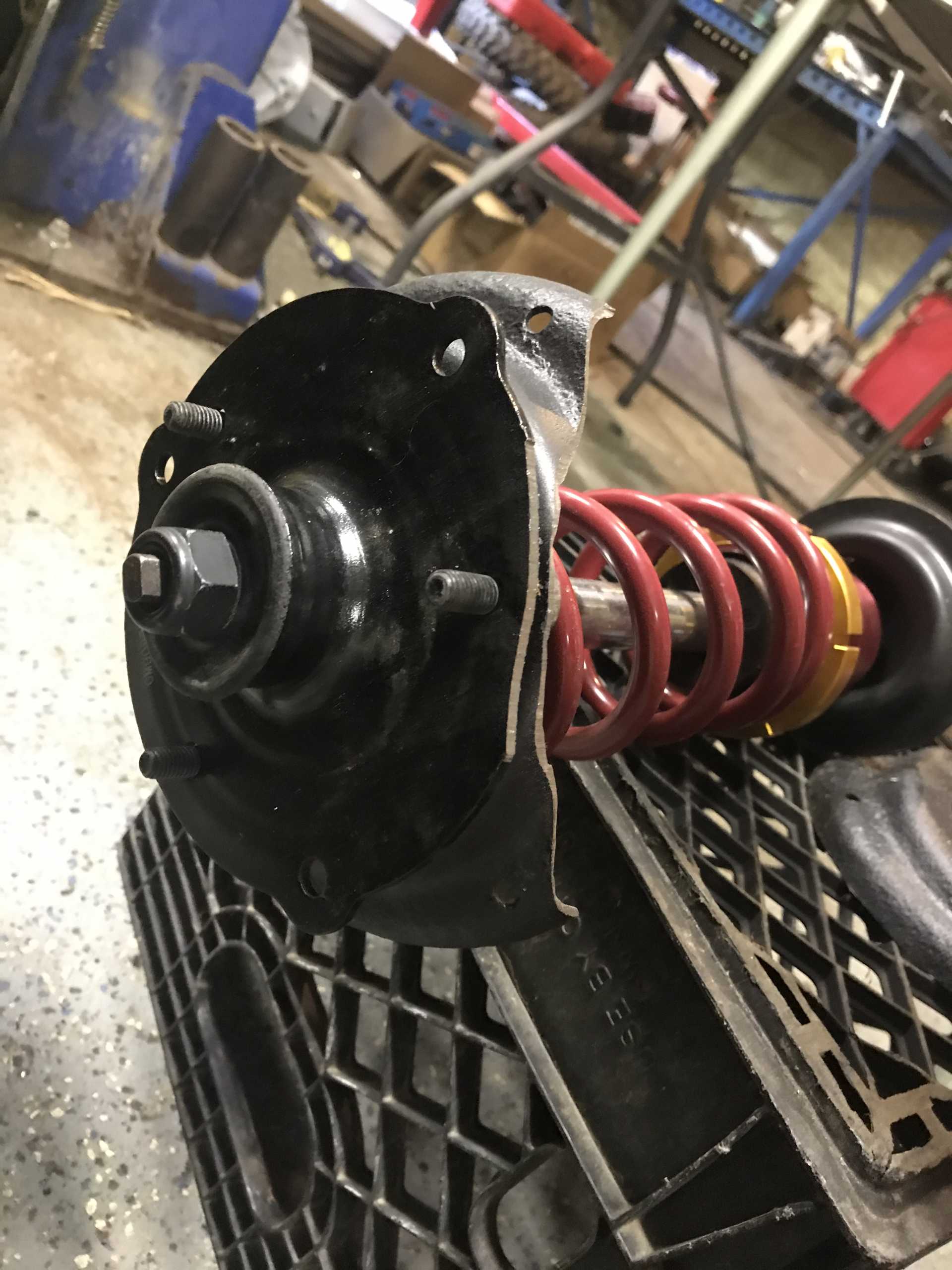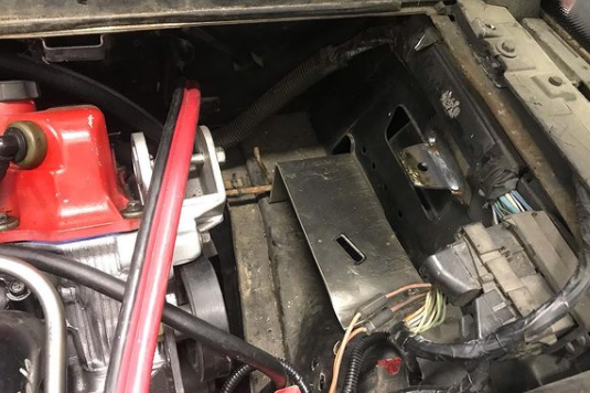 Here is the car as-is. It is kind of a bad picture, but you can see the tank mounted in the corner. The main ground is mounted at the bottom of the bracket of the tank. The engine ground is mounted on the other bolt of the same mount. There is a positive battery junction on the strut tower as well that I wired in yesterday.