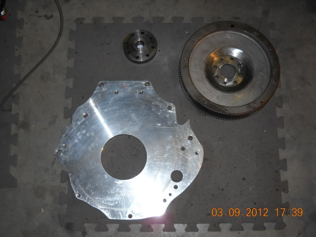 Since I did not document the trans/engine adaptation I guess I have a chance to do it now. It seems like I have to do eveything at least two times to get it right. Here is the modified adapter from Kennedy Engineering and the spacer and redrilled flywheel. I'm going to take Bubbjoes advice and machine clearance into the adapter for the flywheel. I measured the crankshaft enplay and it was .005"which is good, so I think I'll get .1" machined into the adapter just to be safe. Here are some pics before the machining.