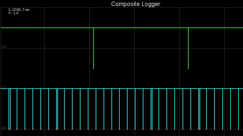 The dizzy (cam) sensor is represented by the green trace; we only see every other edge in the log. In reality, it is a square wave with approximately a 50-50 duty cycle.