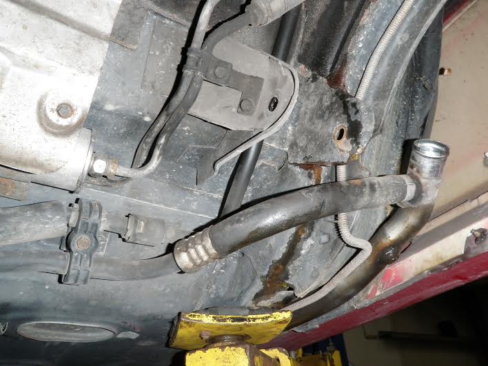 The lower heater hose, the one that comes off the right side coolant pipe, needs to be replaced. One end in swedged on to a hard line and the other end clamped to the coolant pipe.