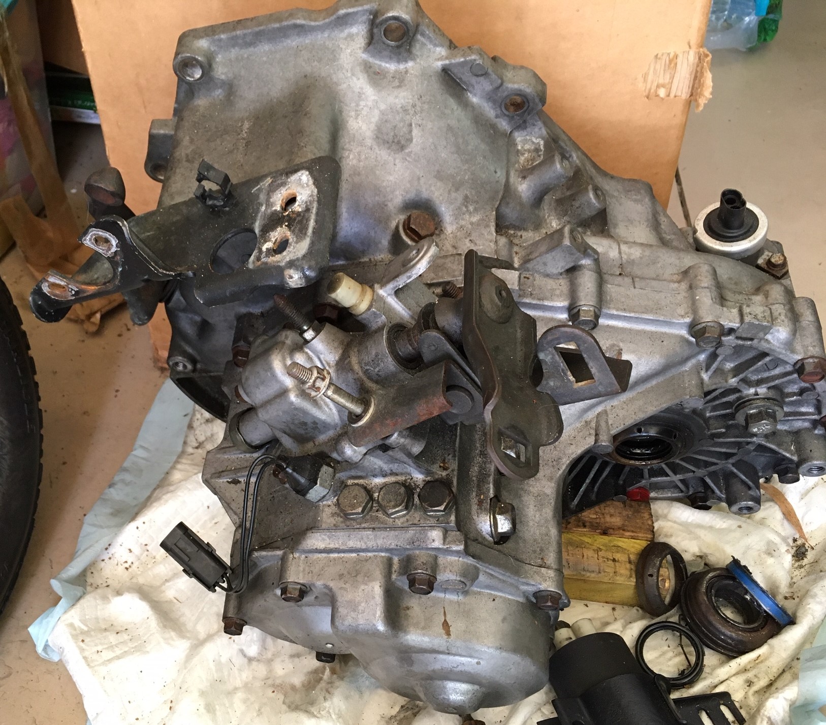 On mine that whole assembly that houses the levels/shafts has at least been removed and replaced because it has blue gasket stuff on it. I cannot imagine the guy that sold me the box swapped out the original assembly for this one so I am assuming it's the original one which makes me doubt that this was ever a FIERO Isuzu but perhaps a suzy mt2 from some other car in whuch case, what are the rations because the whol point of this was to get a lower reving engine at hiway speed.