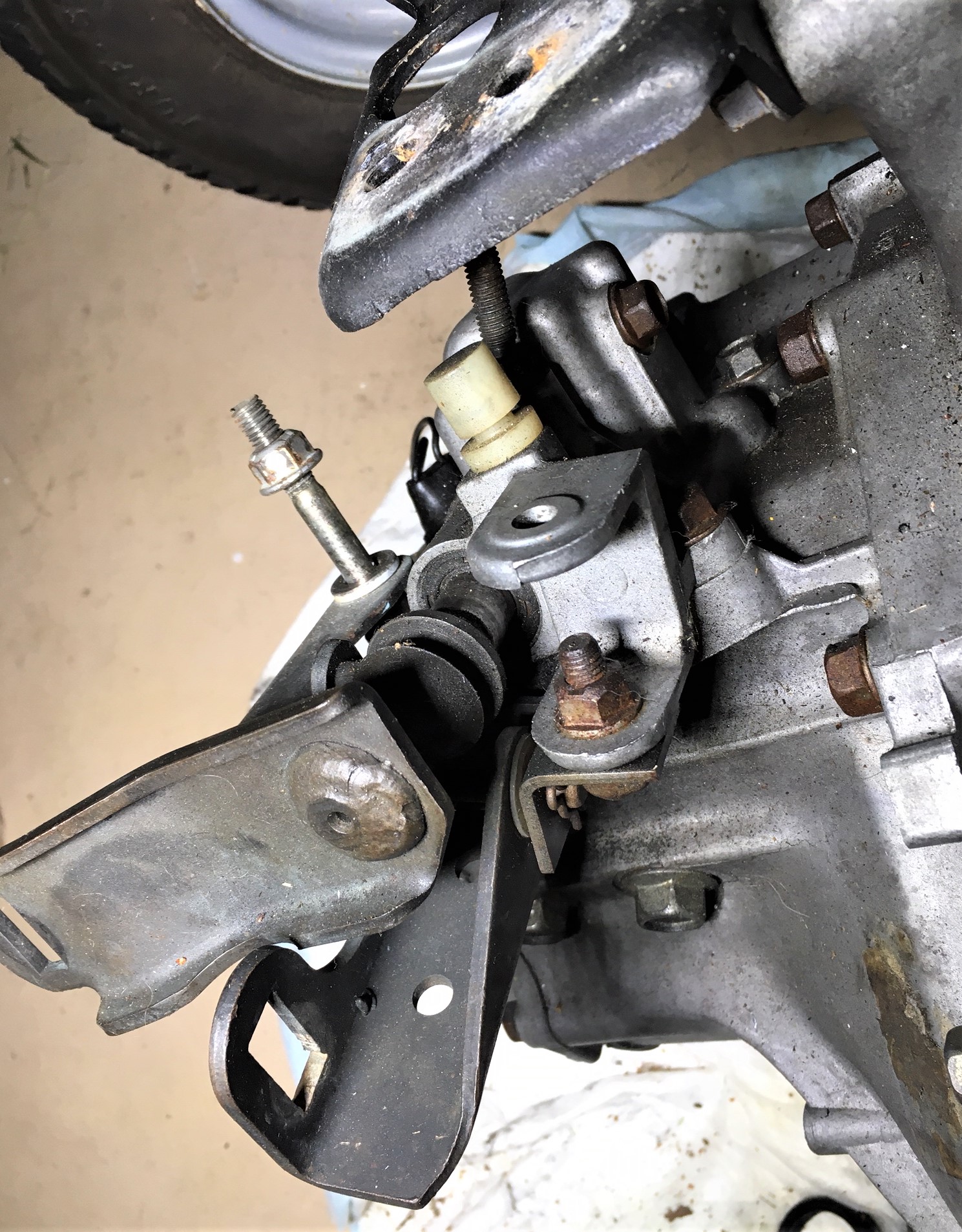 Thanks for those. On your pics the long shift lever is horizointal and the select moves up/down. On mine the long lever is vertical and the select moves to the side towards the bellhousing so the whole thing is turned 90 degrees.