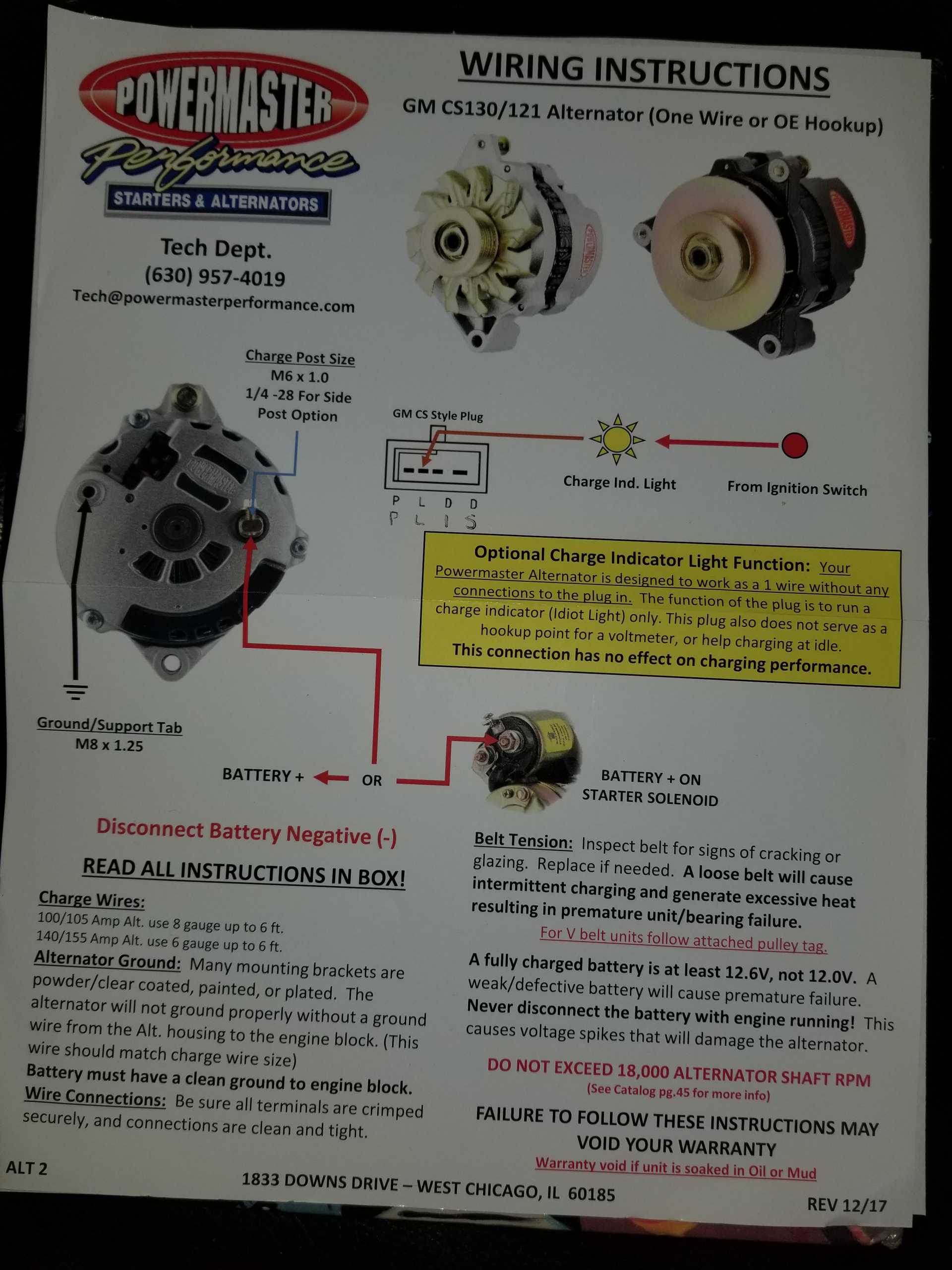 I've been having charging issues on my 88 GT Fiero. I have decided to replace the alternator and clean up/ replace the wiring. I believe the wiring has been mucked around with by previous owner(s). I have gotten a Powermaster CS 130 Amp alternator. The paperwork for it (attached) is calling for 6 gauge wire to be used. I am planning to connect the alternator (side post) to the junction box using 6 gauge wire, and then run a wire from the side post of the alternator to the S pin for the CS plug. I am not planning to connect any other wires to the alternator. I am also going to replace the wire from the junction block to the positive terminal on the battery with 6 gauge wire as well.