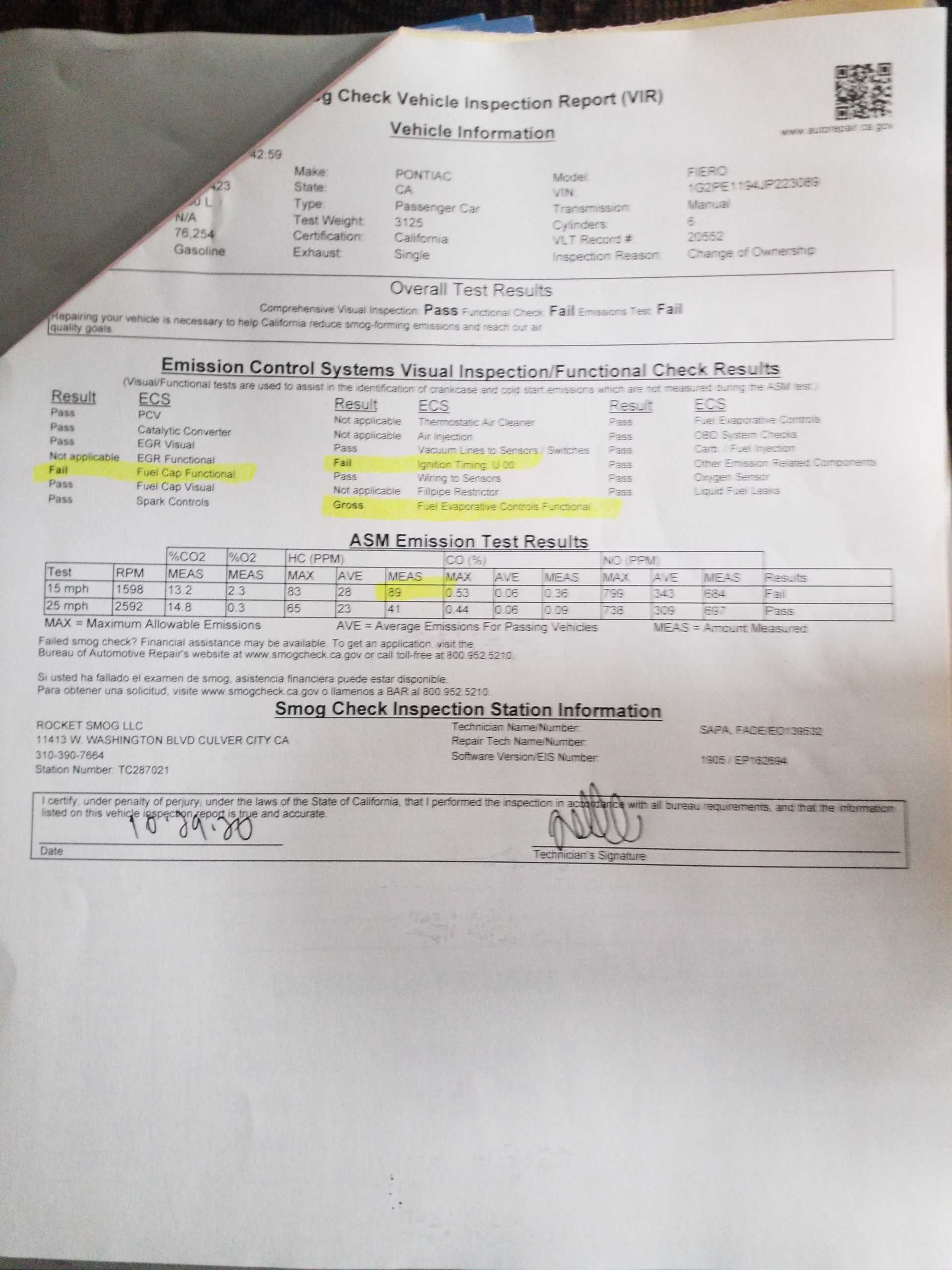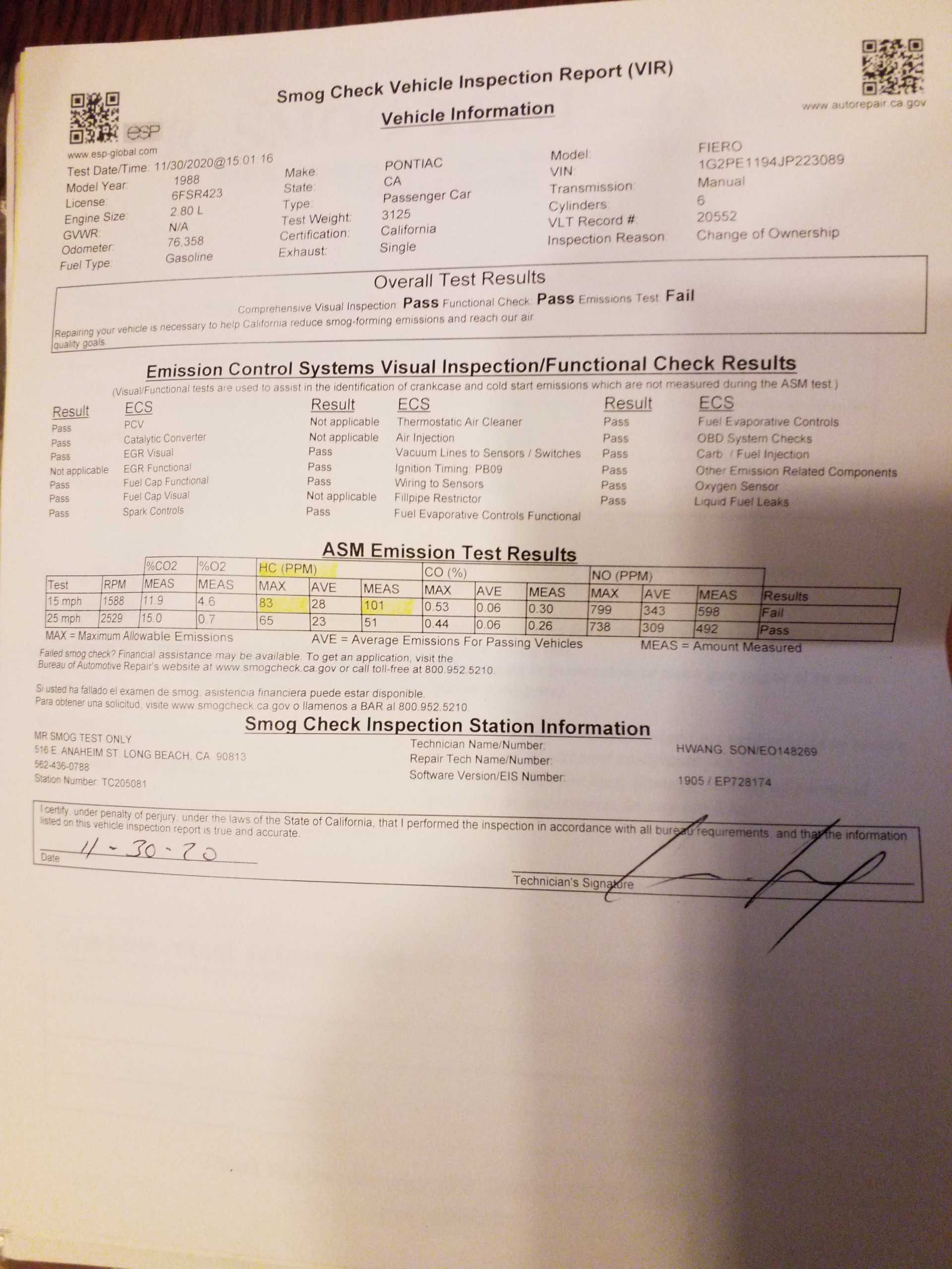 I would like to get this thing legal ASAP. I moved to California a year ago and the last car I bought in CA is pre-1975 smog exempt, so this is my first enounter with the California procedures. I'm from Colorado and there they will give you a temporary tag good for 60 days or something to get your emissions all sorted after getting a used car. California will only give you a one day pass, so I have to take the metro 2 hours each way to work until I get this Fiero on the road. I took it in for a test yesterday and failed on: