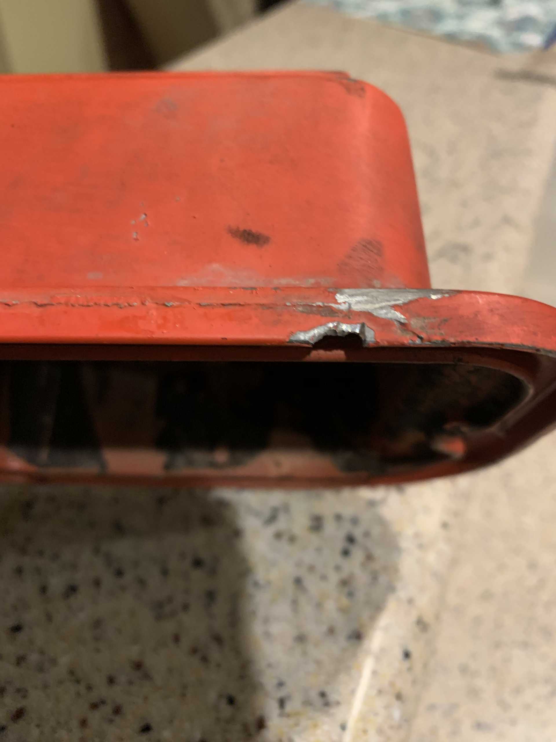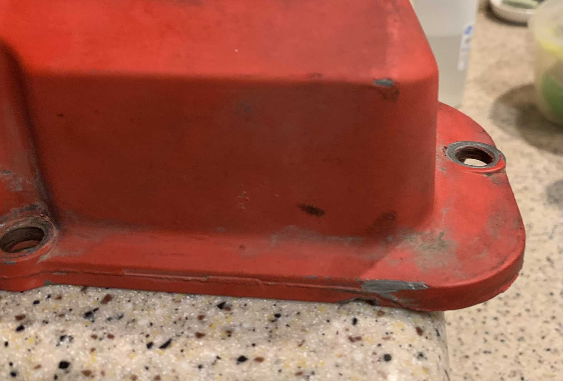 I yanked my valve covers today as I’m planning to get them and my upper intake sandblasted and powder coated. While I was cleaning them up I saw my front side valve cover had a chip on the outer bottom lip.