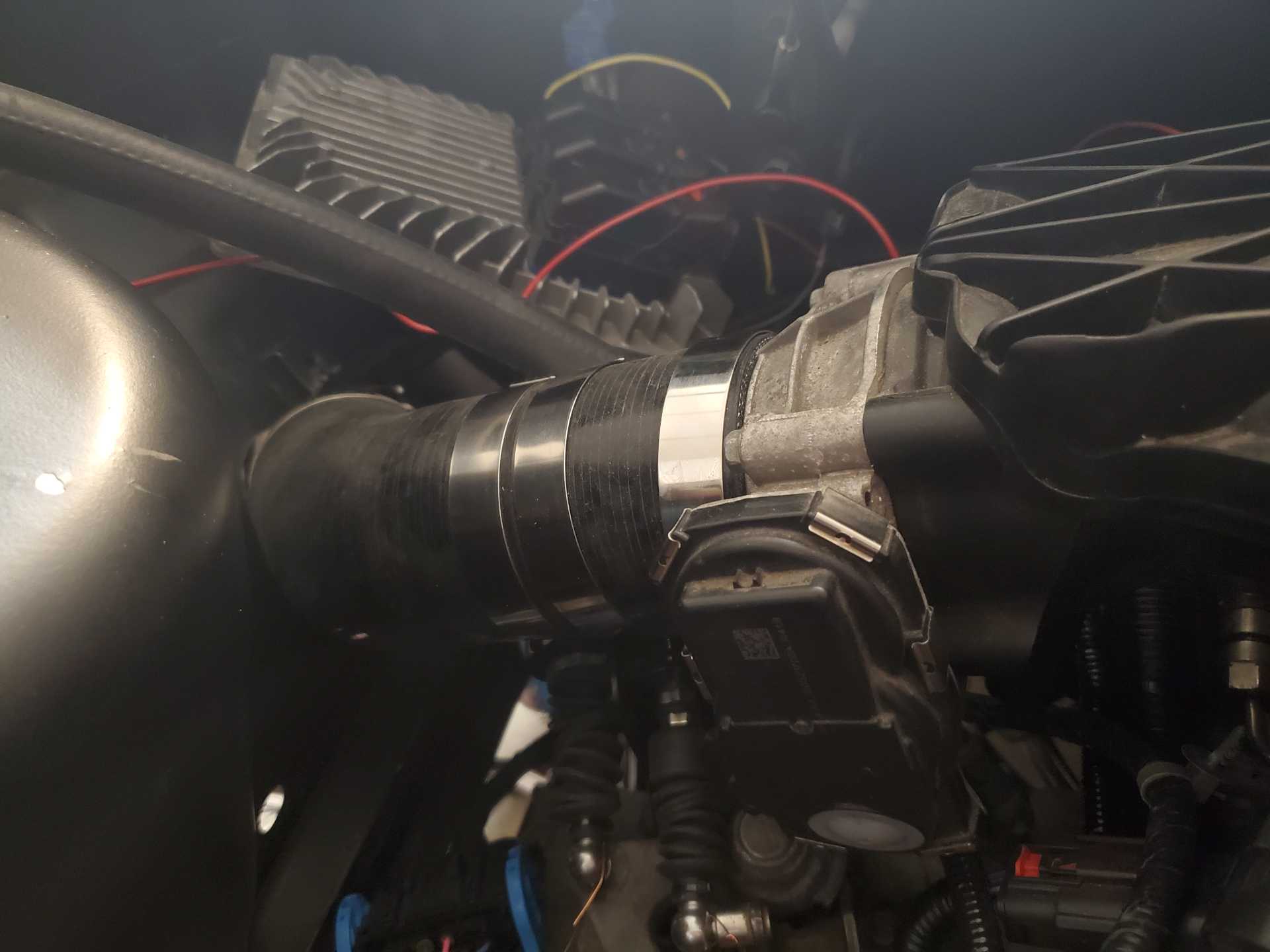 Intake - The intake on the LFX is reversible; I flipped my intake 180*. I had to do some gentle clearancing with a dremel on some the ribbing on the throat of the intake to clear the high pressure pump, but it was pretty simple. I then used some couples and a 45* bend to aim it towards the stock intake location. I had to cut out some material from where the stock intake penetrates the wheel well to get it to fit. Finally, on the intake tubing, I 3D printed a piece that I sealed and secured to the intake piping for the MAF sensor.
