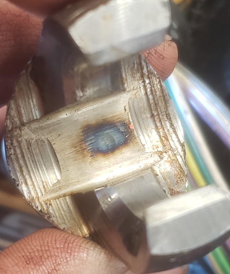 But, looking at the machine work for the actual pivot, it looks like there is a spot weld. There is a small circular spot with a heat affected zone around it.