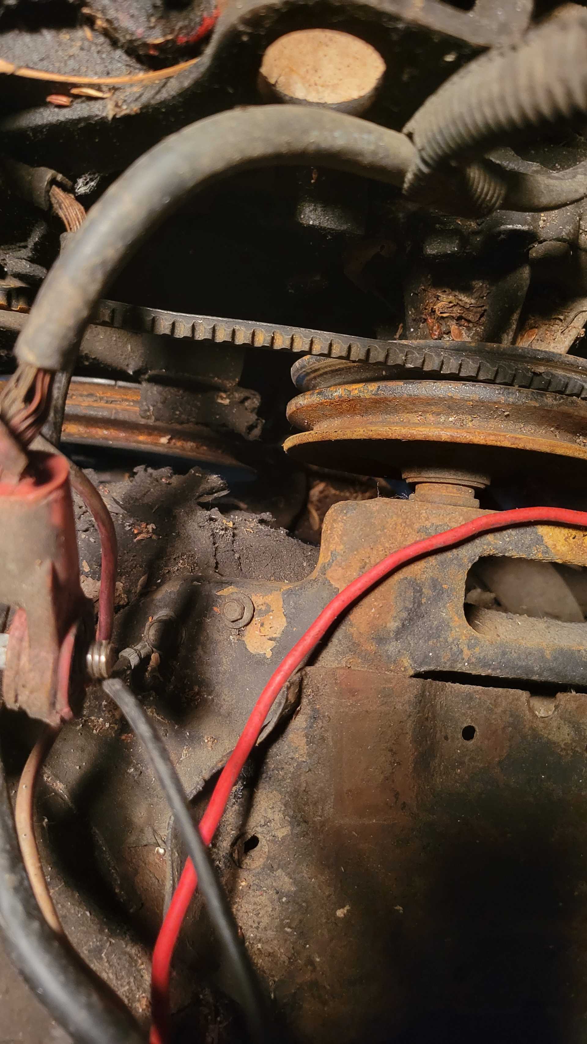 The bit of metal I see on the pulley is the timing scale as Steve Patrick suggested. The belt doesn't go underneath it. It has a tube protruding upward. The tube isn't used in our timing application. It was a factory tool. Clean that scale very well so you can more easily adjust the timing if needed. The deepest groove on the scale is Zero Degrees. Each valley and peak from that is equivalent to 2 Degrees of timing.