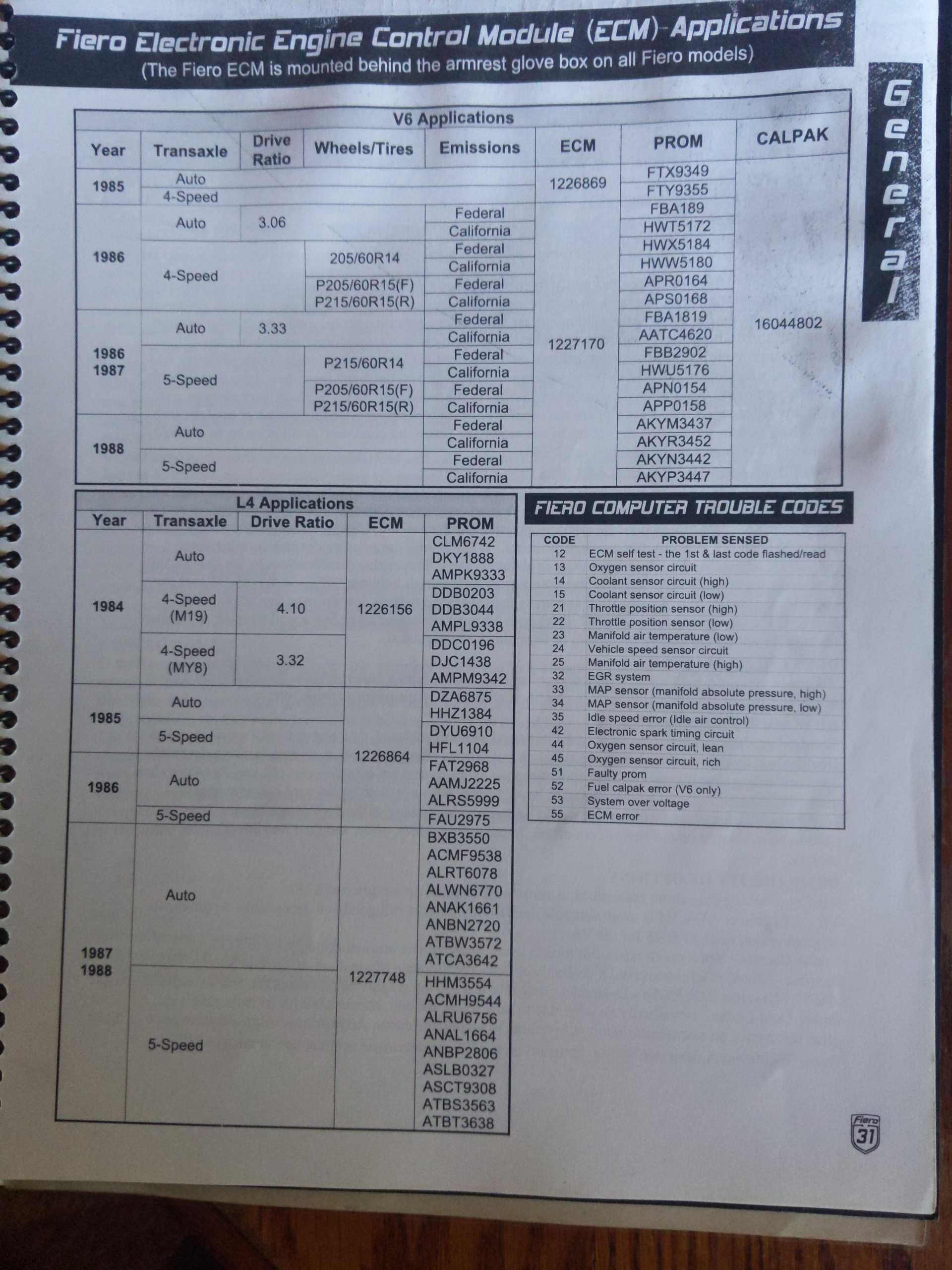 I have a 1984 Fiero with the iron duke and it cranks but won’t start. It gets good compression, spark (tested both plugs and wires), but the injector isn’t getting any power. The injector itself works (tested with 9-volt battery) and when I removed the fuel line from the TBI there was fuel there. I haven’t tested fuel pressure yet, but the pump, filter, and rubber lines are brand new (I will be testing pressure tomorrow just to rule that out). I have also replaced the distributor, ignition coil, and ignition control module (ICM and coil both tested bad). The fuses in the fuse box under the dash are all good as well. I personally think that there are issues with the wiring as there are some pretty shadetree things with it that I have had to fix (does anyone make/sell wiring harnesses for the 84 iron duke?). Does anyone have any ideas or other tests I could do to get it running? I am also confident it is not the ECM because the tach sits at 400 rpm while cranking. Tomorrow, other than testing the fuel pressure, I will also be testing the ignition coil and control module again to see if they are bad.