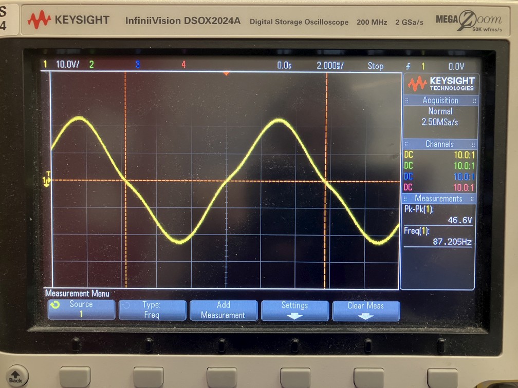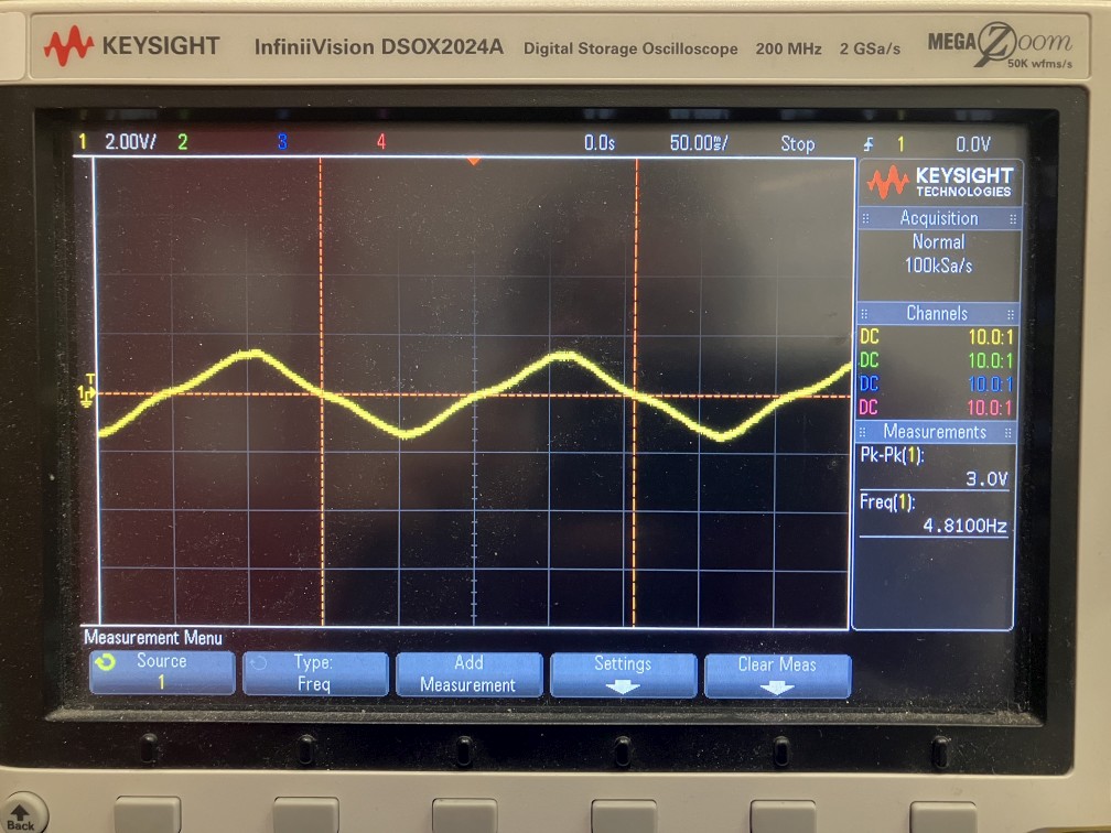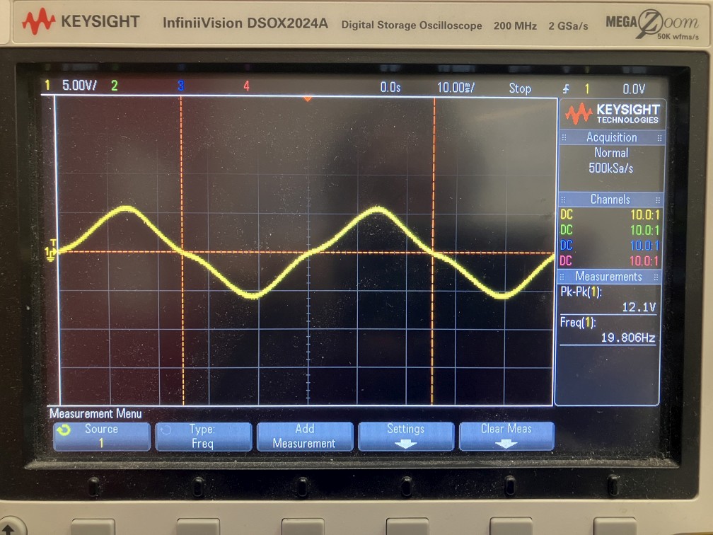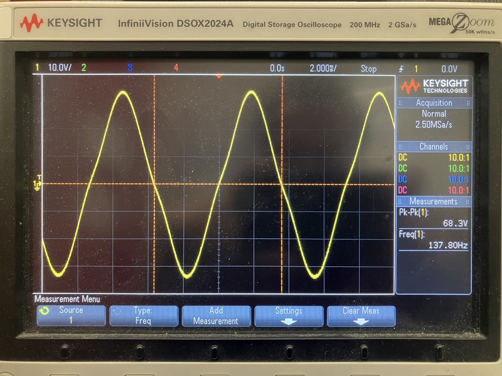 In the bottom-right area of the oscilloscope screen, I had the oscilloscope display the peak-to-peak voltage as well as the frequency: