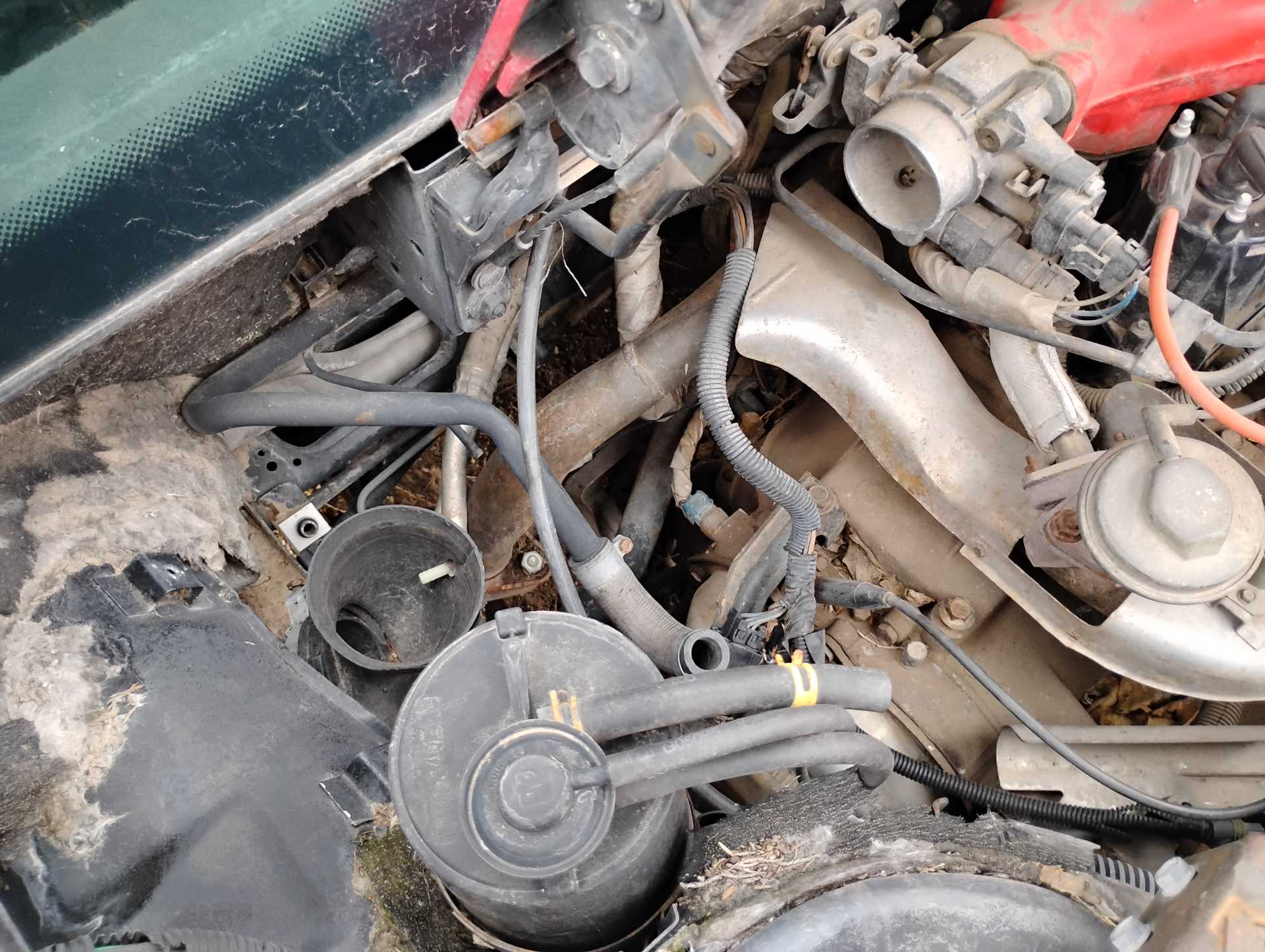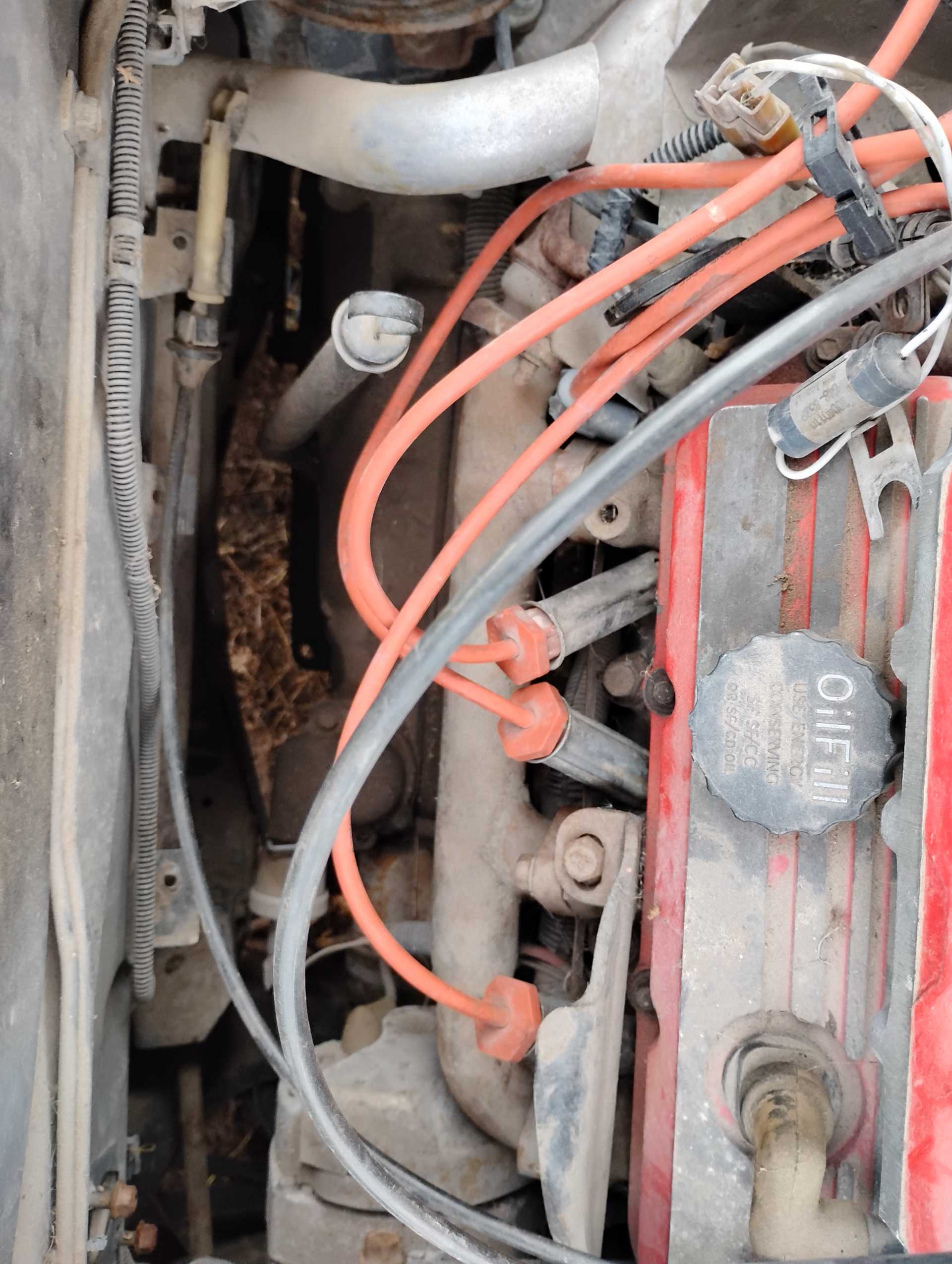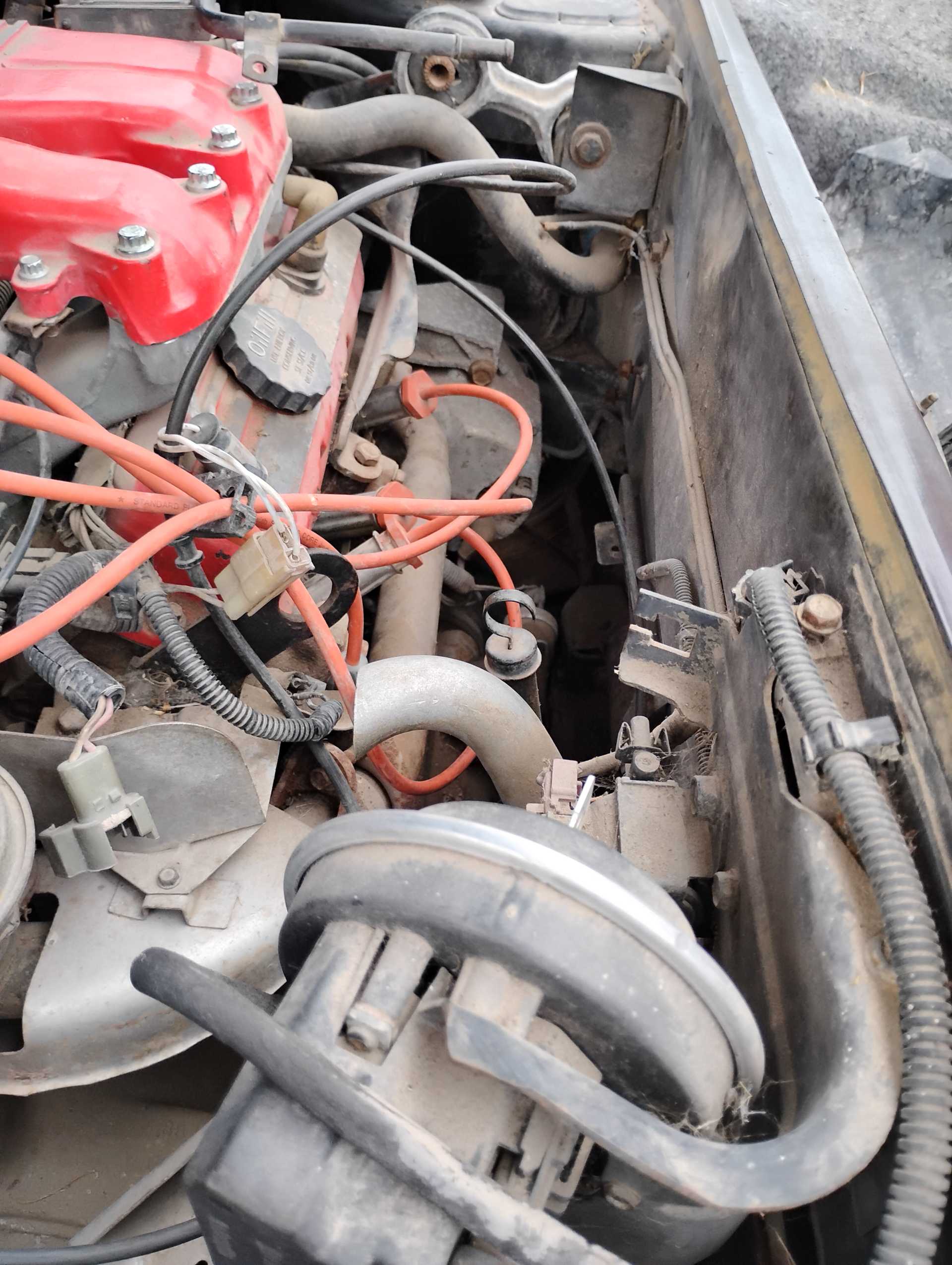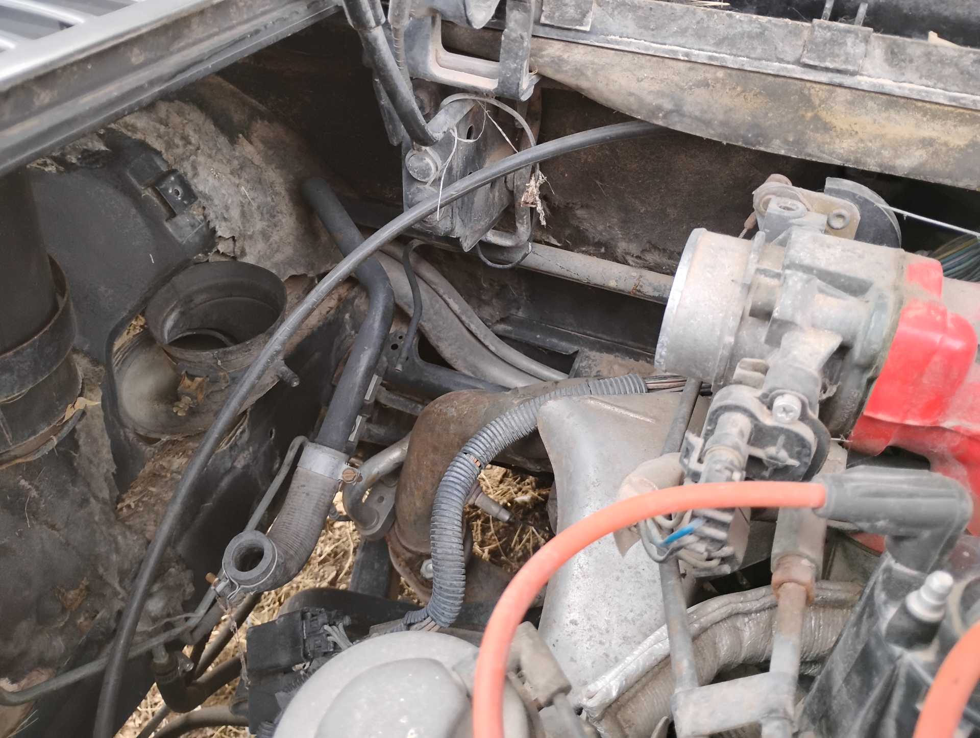 Missing air filter housing Missing air filter to throttle body hose Missing A/C hoses A/C & Fuel Pump Relay harness not attached to firewall Missing vac lines to charcoal canister at canister end Missing cruise cable (I think it is the one in the wrong position & hanging down on the throttle body) Missing ignition coil Mud Dauber in IAC port Missing 3 spark plugs wires TPS lever looks like it is in the wrong position TV cable is not routed properly Air tubes for coil and alternator missing Missing vac lines to charcoal canister at intake end Missing/broken exhaust manifold bolts Dogbone disconnected Heater hose to water pump disconnected and hose looks to be too short Missing battery Fuel lines to filter and tank disconnected and in wrong position