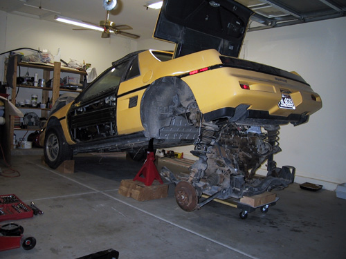 This is the car up in the air and engine hoist out of the way. Ready to roll that sucker out of there...