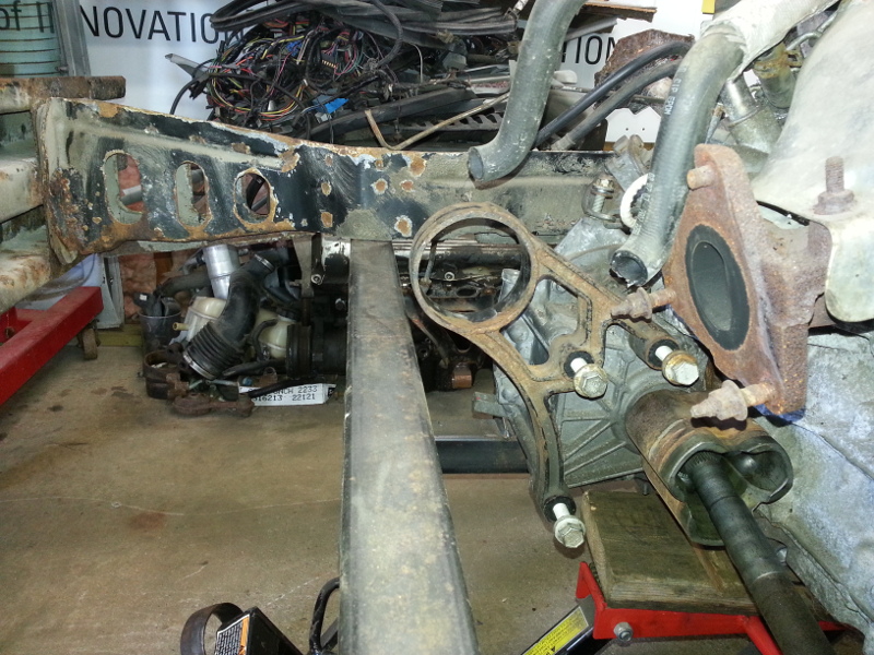Shortly after bringing the car home, I removed all the body work. Where to start? Let's build a simple cradle, shall we? Okay guys, here's my take on a "simple", square tube cradle that I whipped up. It's only tacked but fits in the car like a glove. Since I'm going to install an L61 2.2 Ecotec and matching F23 transaxle, I wanted something I knew was square and strong so I could have some place to mount my drive line to. Now, the design changed slightly. I built it with the 84 lower control arms in mind. However, I've now decided to use the 88 knuckles and suspension instead. This cradle is heavier then stock but it's also stronger. Besides, the one on my car was a little too crusty for my liking.