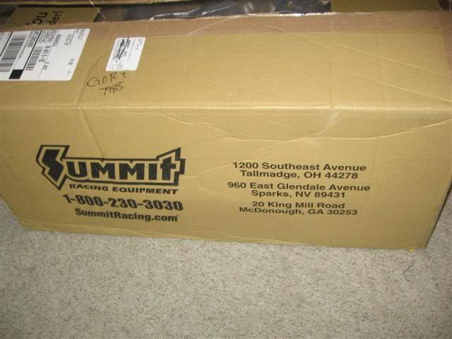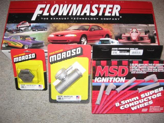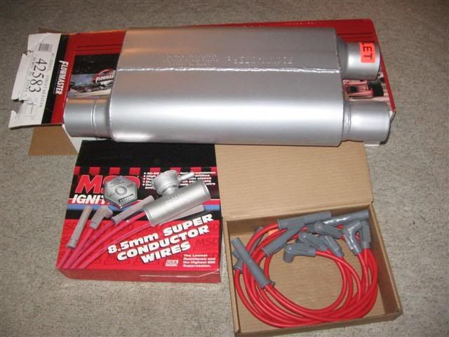+++++ for Summit Racing! Placed a order on monday, and already got the parts in today! Order a 80series Flowmaster muffler, 8.5 MSD wires, inline T filler w/ cap, and a "intermediate pipe" for the exhaust thats on backorder so I havn't got that in yet. Another step closer to getting the swap done!