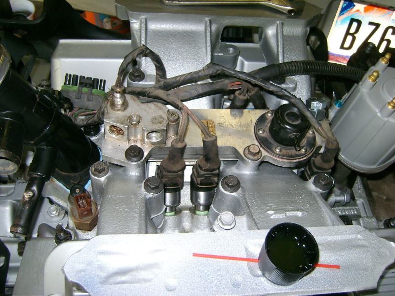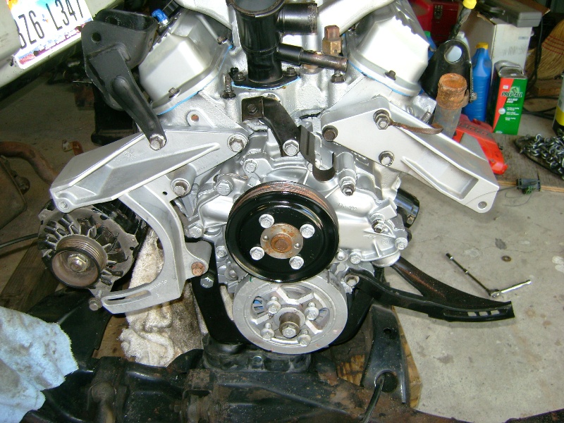 I was able to get a lot of little things done this morning. AC mount brackets were put back on the engine. Front engine mount bracket was modified to accept the lower AC bracket. Rear Coil mount was added. Middle intake mounted and torqued to specs .Cross over pipe was put in place. I am gonna remove it tomorrow and clean it up , and add some gloss black paint. I have the wrong Alternator. Will not line up with the mount bracket. Installed the throttle cable into the body. So much fun to be had doing this! NOT