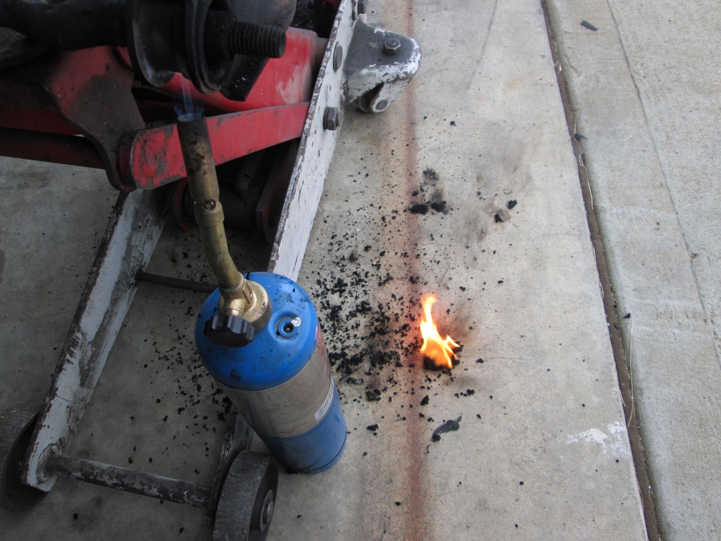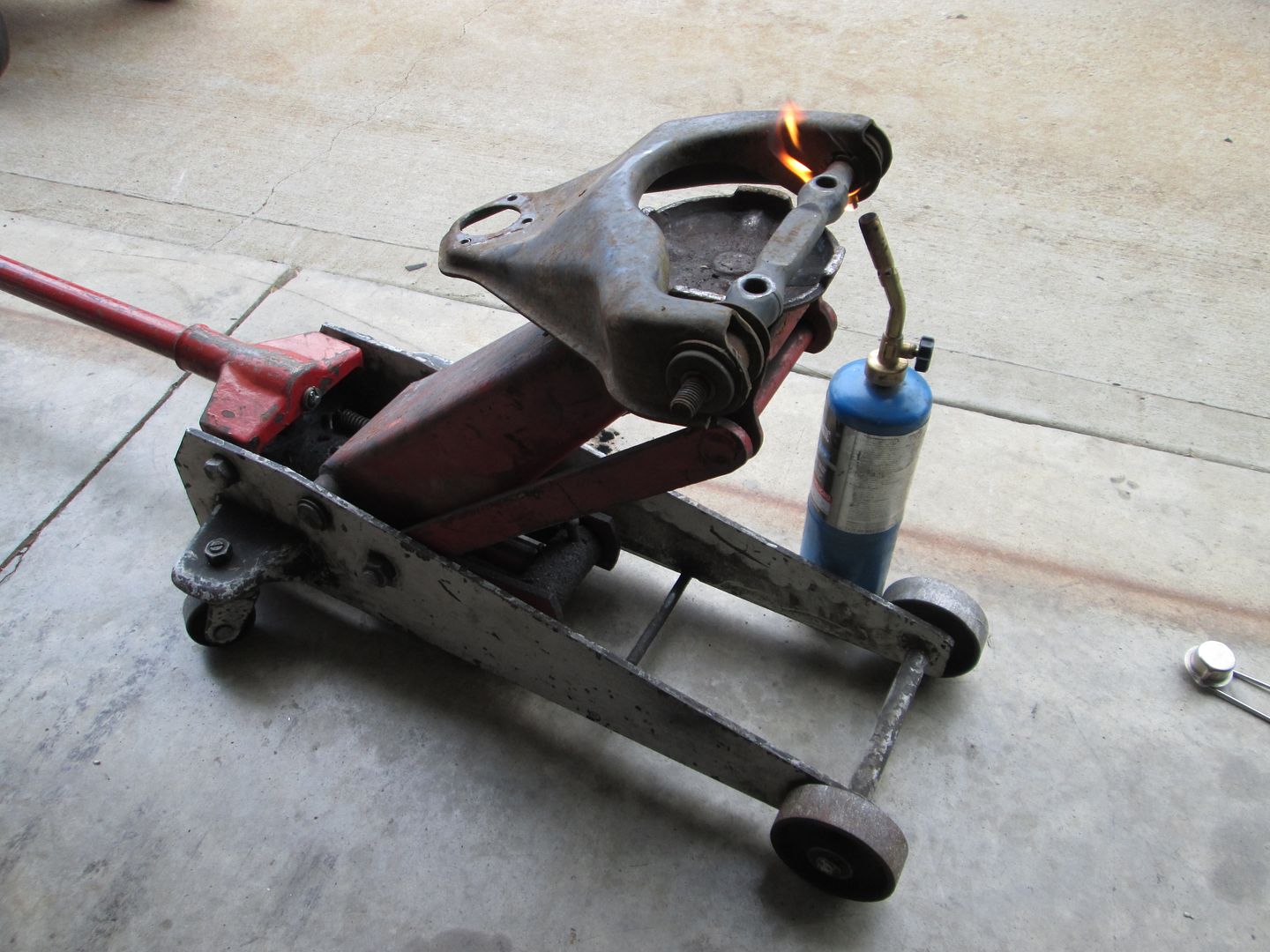 Set the upper a-arms on the jack, set the propane bottle under it and let it burn for about 10 minutes. Lots of smoke/fire, but got the bushings out.