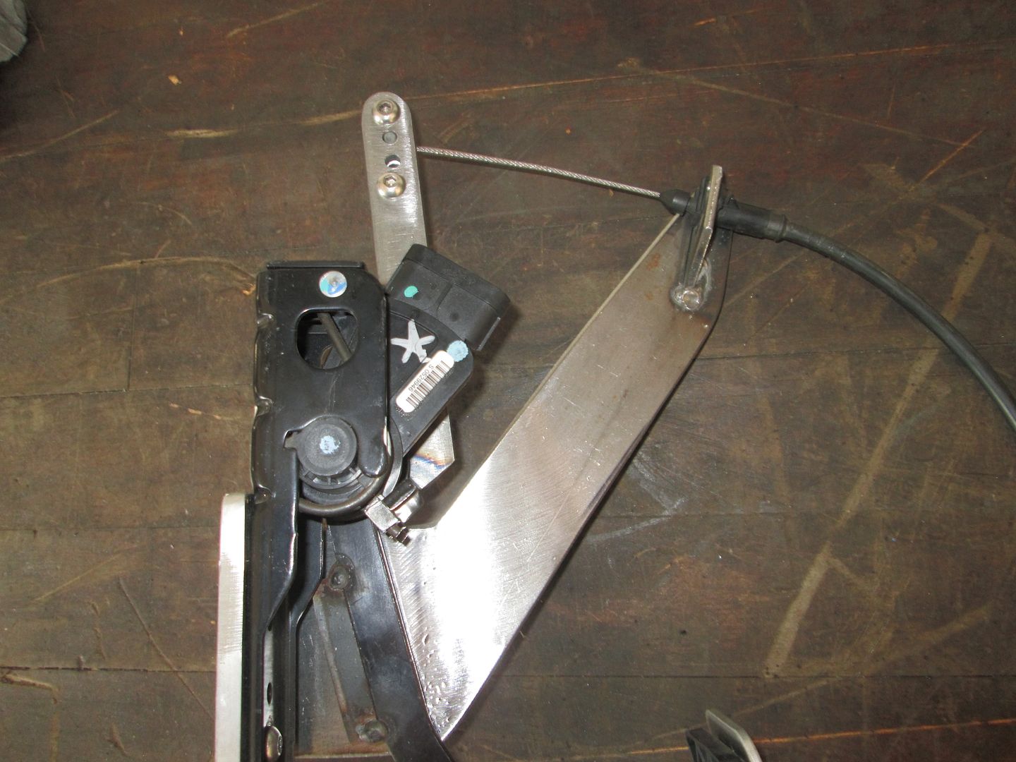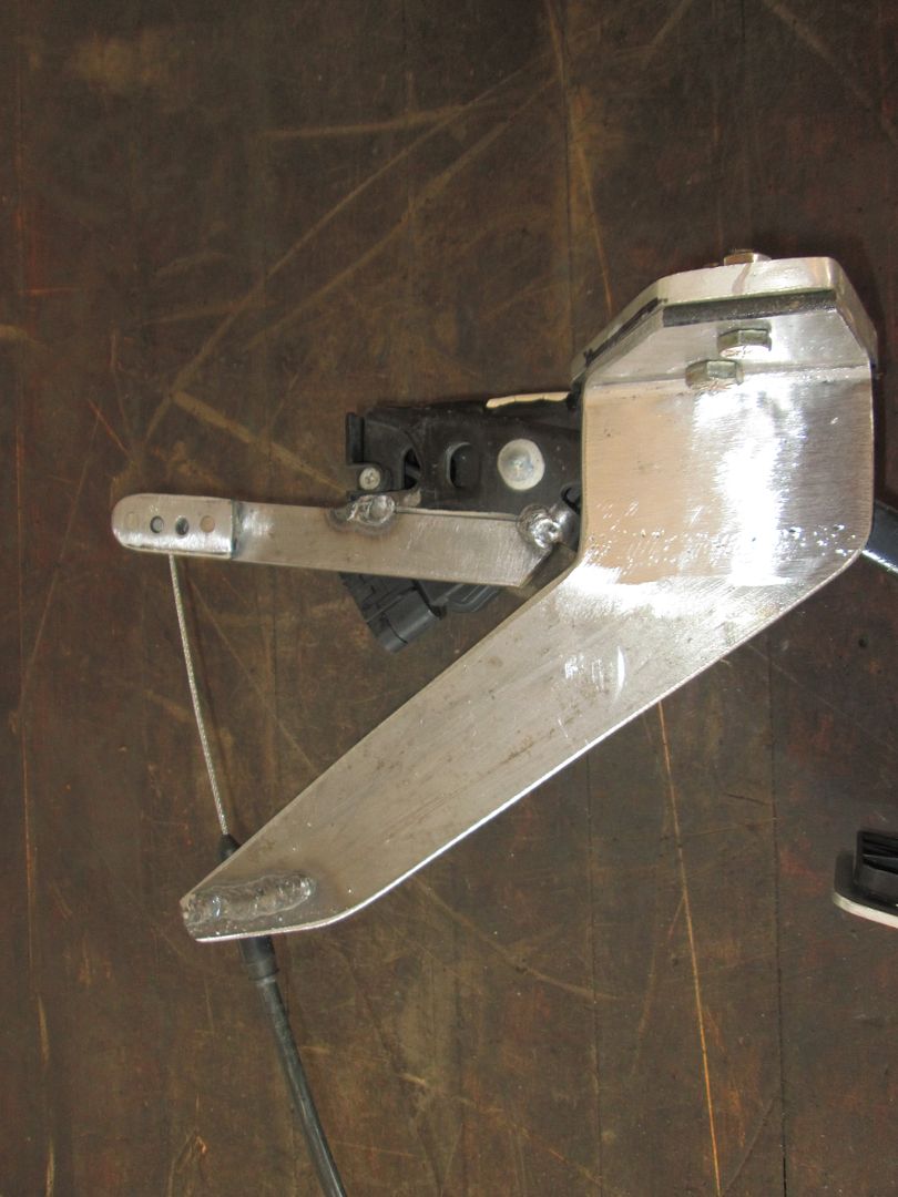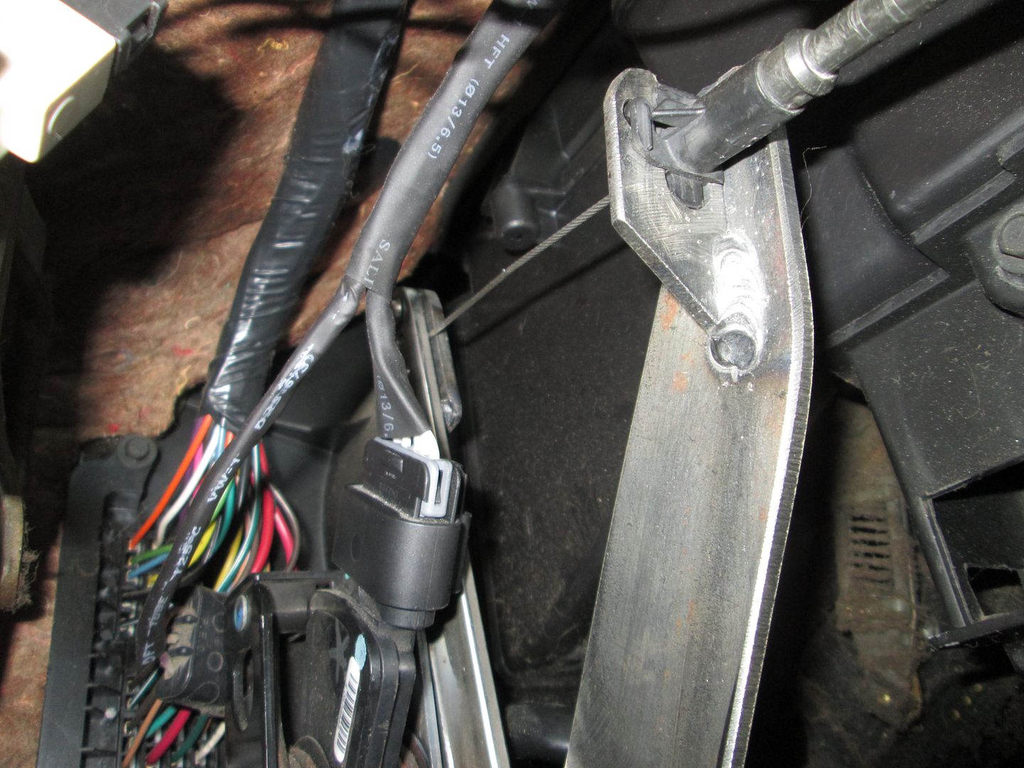 The cruise module pulls the cable to speed up, so I needed a bracket that would pull the pedal towards the floor. So I fabbed up an extension to the top of the pedal and a cable mounting bracket that comes off the stock 2 bolts for mounting the stock fiero gas pedal. There is slack built into the bracket as you can see here with the pedal fully released.