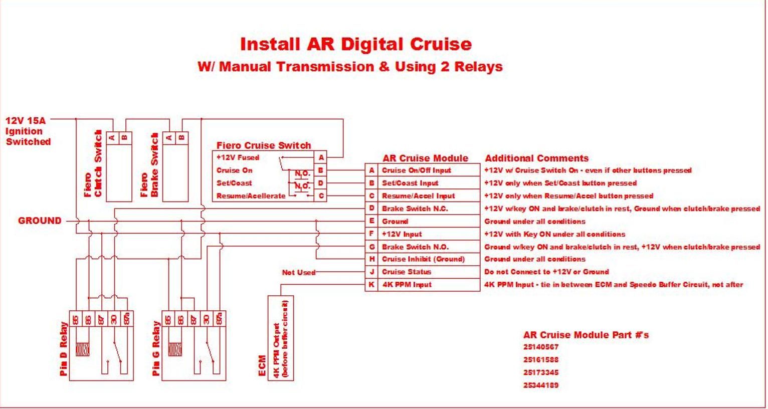 I wired mine up a little different than most others, wiring the brake and clutch (actually a 2nd Fiero brake switch mounted to the clutch pedal) switches in series (so either will cancel the cruise) and used 2 relays for the D & G inputs that must switch between +12V and Ground. When 1 relay is used, the ground signal when the relay is off had to go through the unpowered relay coil and had about 100 ohms resistance which wasn't as strong of a signal as I wanted. It wasn't working at the time (probably for some other reason), so I added the 2nd relay to eliminate it as the cause, but then it still wouldn't work until I got another AR module. Also, as part of the debug process, I found that my cruise stalk was bad, so I replaced it with a new one.