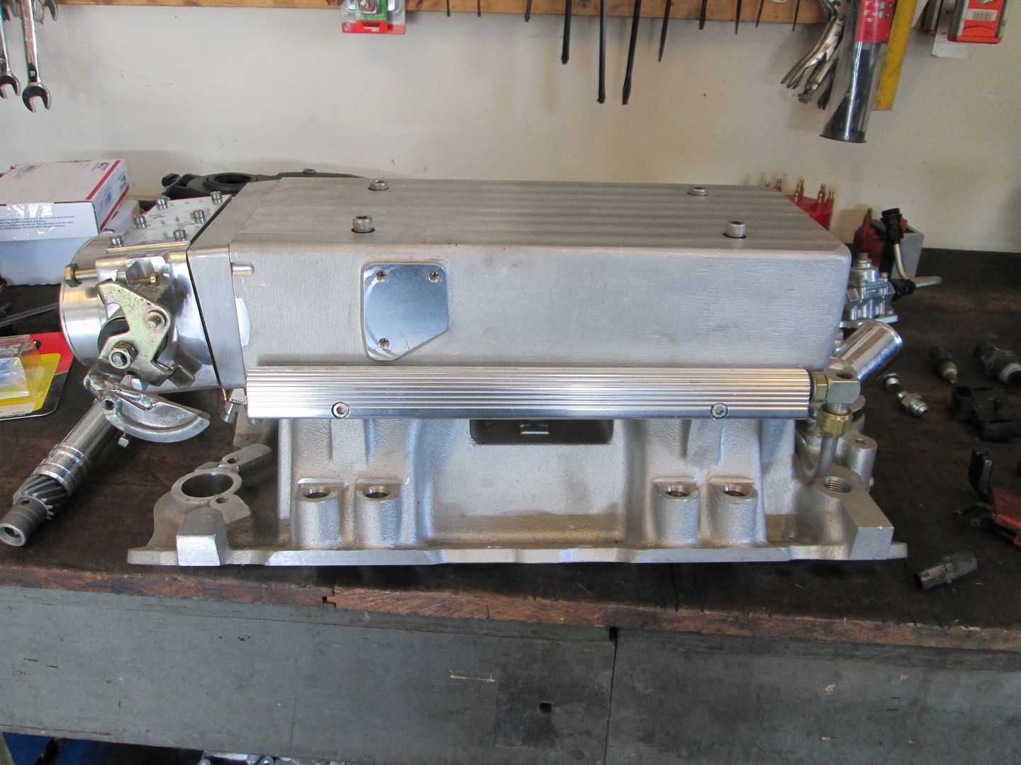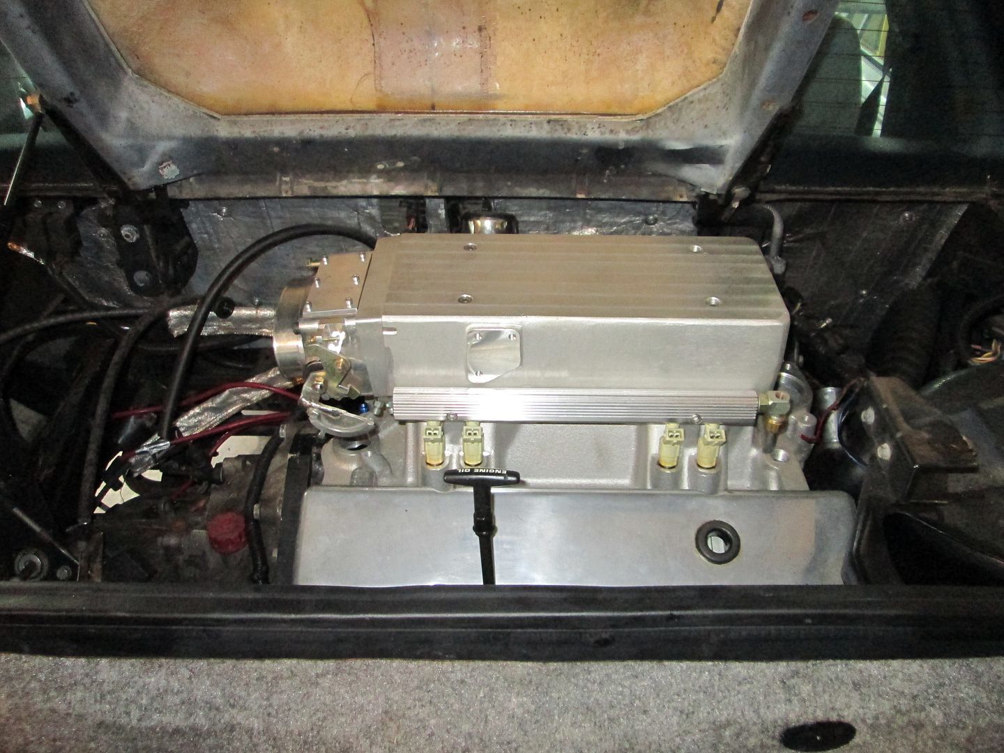 Here is a teaser pic of what the engine swap will look like when done... HSR intake, upper plenum flipped, twin 58mm throttle body. The engine will be lowered as part of the rework to gain the needed clearance for this intake to clear the decklid. Disclaimer: the height of this particular HSR is 9", but a stock one is 10" tall. This intake was modified by gusshotrod to make it lower several years ago, and this modification is what allows it to have a chance of fitting w/o a decklid support notch.