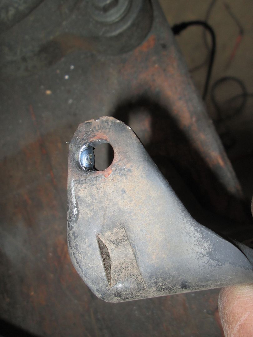 Pressing it back into place. Notice I added some adjustable spacers to support the ears of the bracket during this process. Once it was pressed into place, I used a grinder the shorten the stub shaft so it only sticks out about 1/8" and then used a cold chisel to "X" the bottom like the factory install.