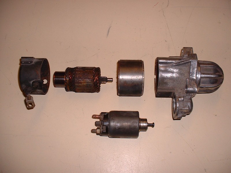 Of course this just means that it would be silly to stick the old one back in without rebuilding it. Mine looked OK from the outside, but it was a different story once I opened it up (another reason not to just install a N* without taking a good hard look at it). Here’s a breakdown of the major parts from top left: brush carrier, armature, magnet housing, gearbox, and at the bottom of the image is the solenoid.