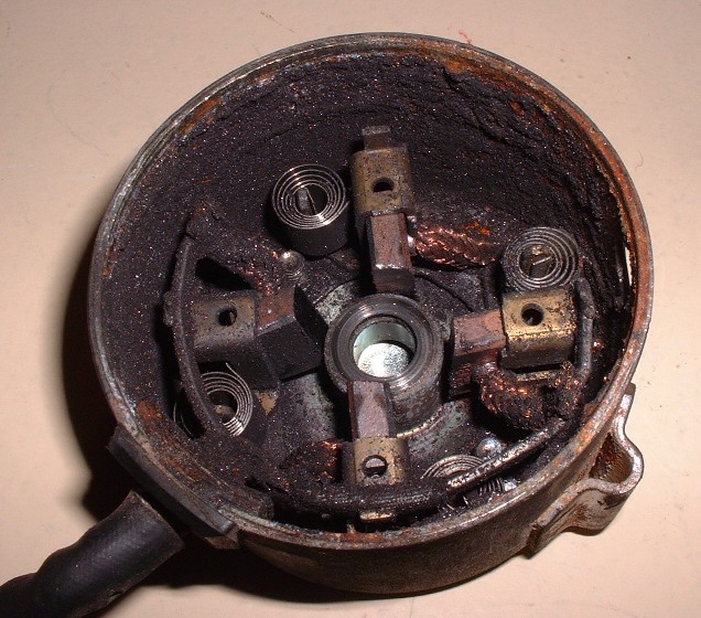 Here’s a close up of the housing for the starter brushes. Note how much dust there is from the wear of the four brushes. I would imagine that at some point in time that all that electrically conductive dust would cause problems. The entire four-brush assembly is held in the housing with only two screws making it easy to take out and clean. Once removed, all I did was spray some electrical component cleaner on the brush assembly and in the housing to rinse it all out.