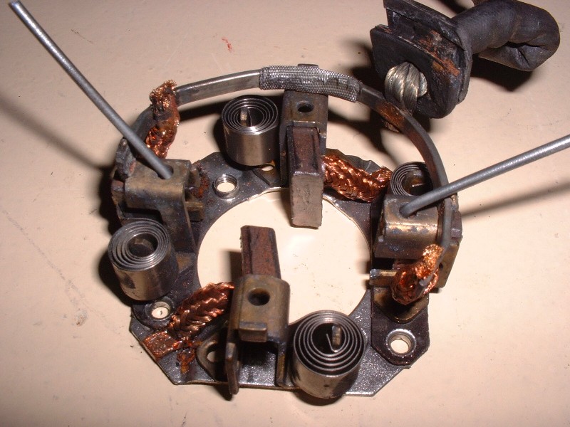 Once the rubber plug for the main wire lead is lined up with the notch in the housing, the brush assembly can be screwed to the housing from the outside. At this point you have to be careful not to turn the assembly upside down since the armature will fall out. If that happens you have to remove the brush assembly again and retract the brushes with the pins and start over again.