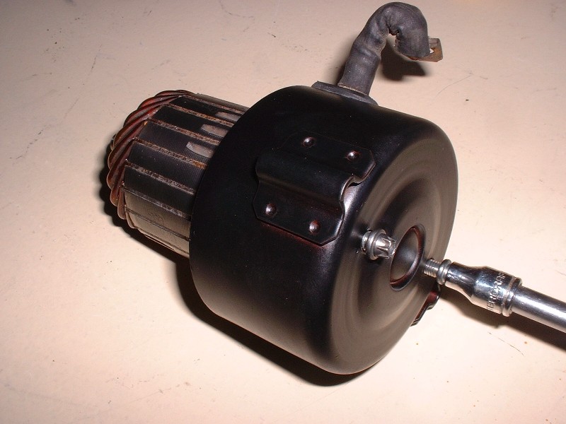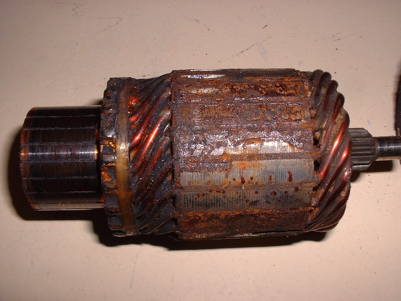 Here’s the commutator/armature assembly before I attacked it with the wire wheel on the bench grinder. (The commutator is the part on the left and the armature is on the right.) Mine had obviously been penetrated by moisture and sat in the same position for some time as the armature had a build-up of rust on one side. If you use a wire wheel to clean one up, you have to be careful not to grind away any of the insulating varnish on the copper wires of the armature coils. There was also a lot of ground-in brush dust between the individual sections of the commutator so I took an Exacto knife and cleaned out the grooves.