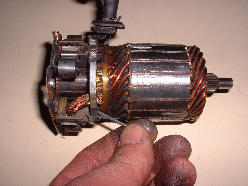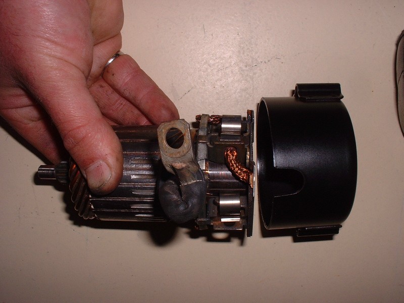 The brushes were nowhere near worn out, so there was no need to replace them. Notice in the picture below that there are holes in the rectangular brush guides that allow you to stick in a small diameter rod to hold the brushes in the retracted position. This allows you to slip the commutator end of the armature back in between the brushes later on.
