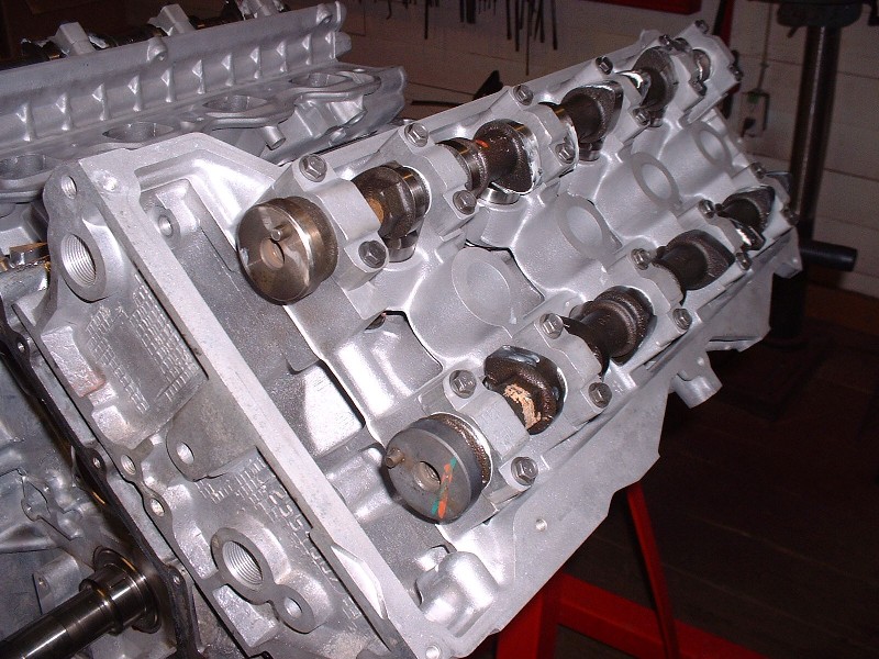 Here’s a topside view of the heads once they were installed. The orangey-yellow stain on the intake cam and the white stain on the exhaust cam are factory paint markings probably to enable the assembly line worker to differentiate between the two at a glance.