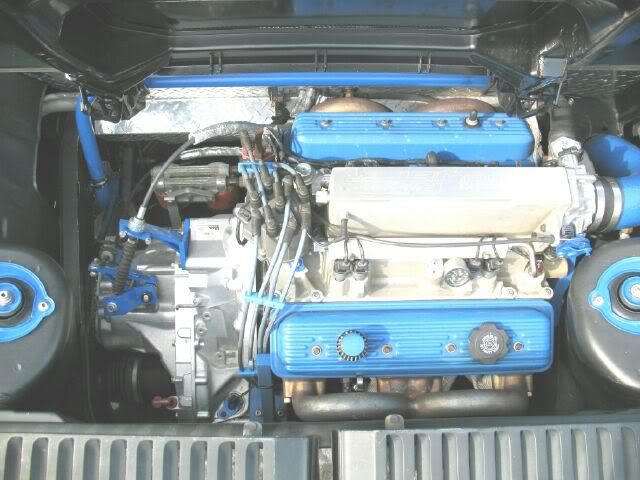 I am thinking the block, heads, valley cover, and transmission will be a silver/alumunum color (to keep oxidation down). The Intake, valve covers, timing cover, coil brackets, engine/transmission mounts and transmission shifter bracketts will all be my signature blue. The fuel rail will either be left stock or painted satin black (to help hide the injector harness).