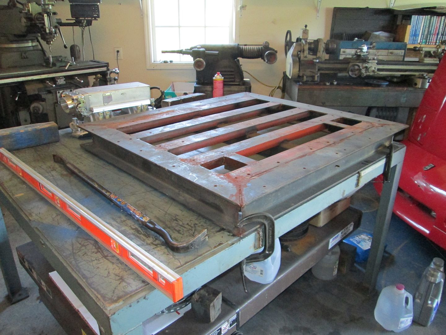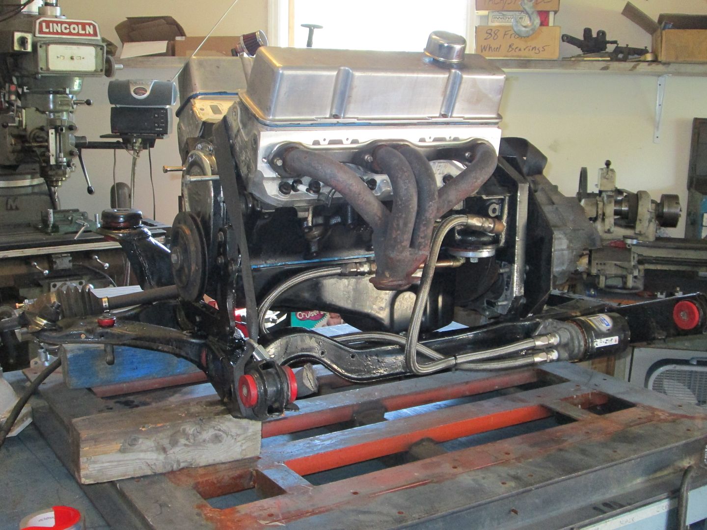 Engine/transmission/cradle just sitting on the cradle fixture. I need to bring the attachment brackets down from the attic and get it bolted down so I can start reworking the mounts to lower the drivetrain and square/level it as the same time: