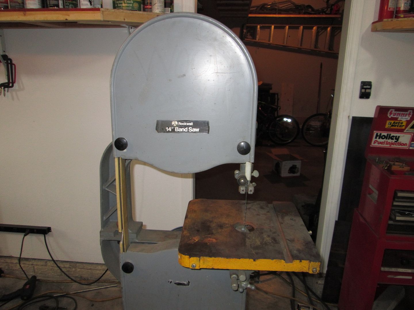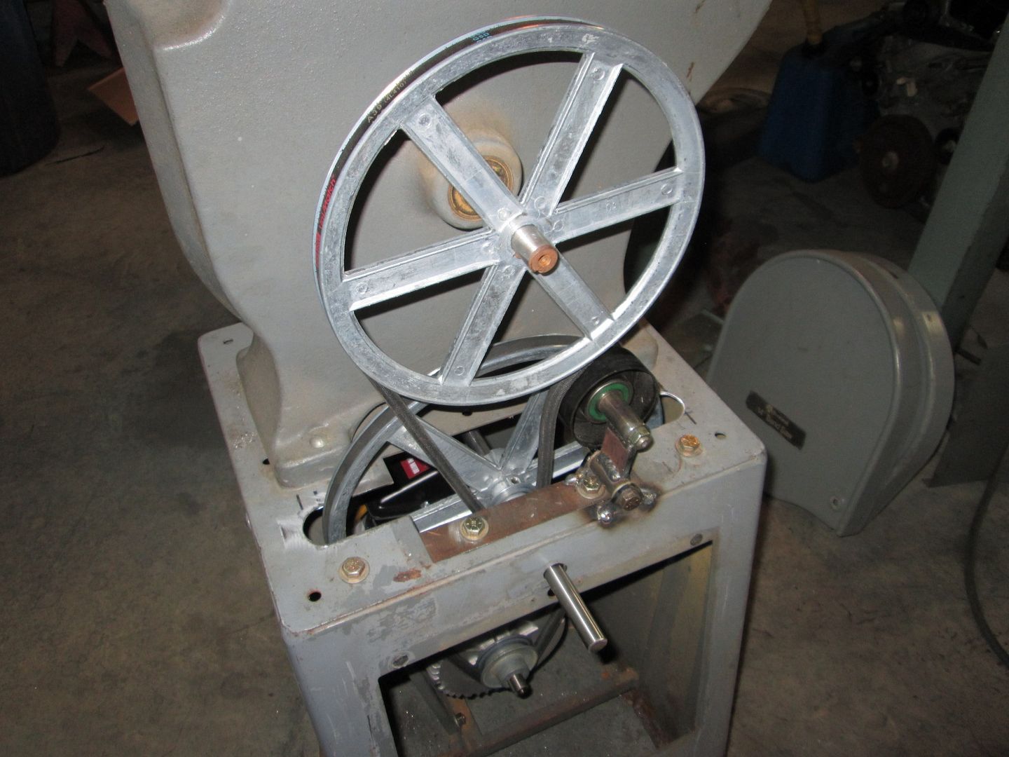 Had a little free time and decided to get the Rockwell 14" bandsaw actually running. I picked it up 4+ years ago on craigslist as surplus from a school, but it was setup for wood (3000 ft/min blade speed) and 3 phase. To convert it to a metal bandsaw, I needed to slow it way, way down. Right now it is 252 ft/min and I have a smaller pulley for the motor to get it slower.