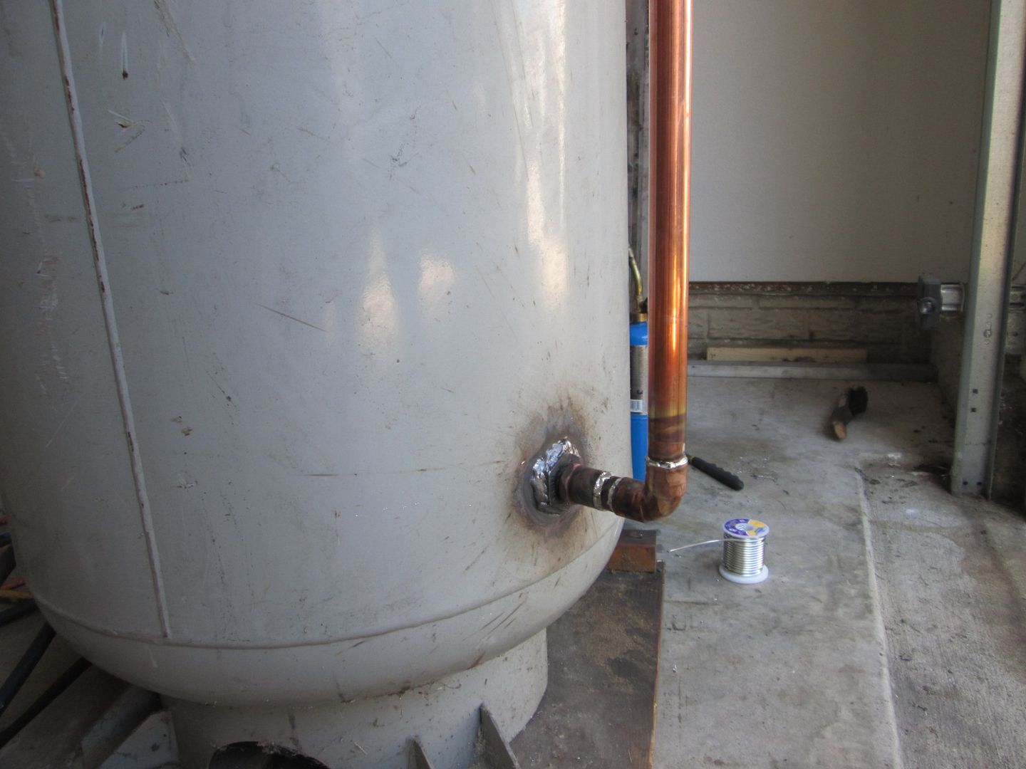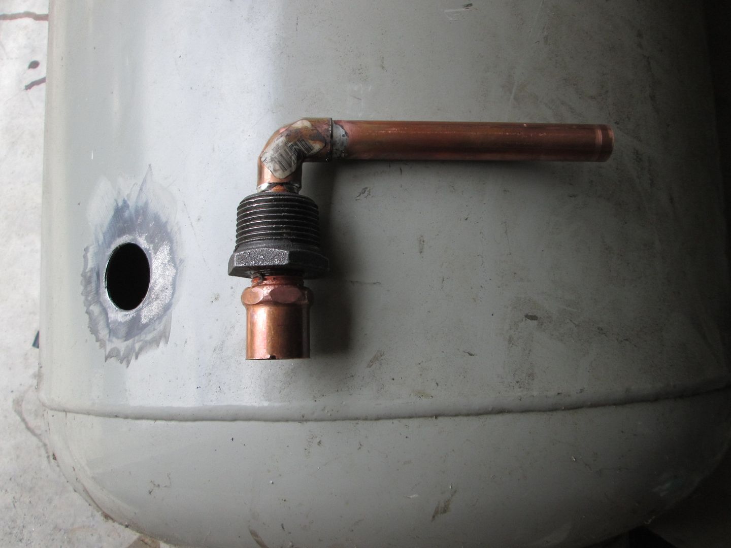 Part 1: Here you can see a combination of cooper parts as well as steel. The steel sleeve is so I can weld it to the tank. The copper portion is made so that I can unthread it once the steel portion is welded so I can seal the threads. There is a notch on the end that is used to ensure the tube inside is pointed to the side. With this installed, as the compressor runs, the air entering the tank will now cause a slight rotation of the air around the outside of the tank tank to help with moisture condensation. It also creates about 3 feet of vertical separation between the air inlet and outlet. Before they both were at the top of the tank about 9" apart, so hot humid air went into the tank and quickly right back out w/o spending much time flowing around inside the tank.